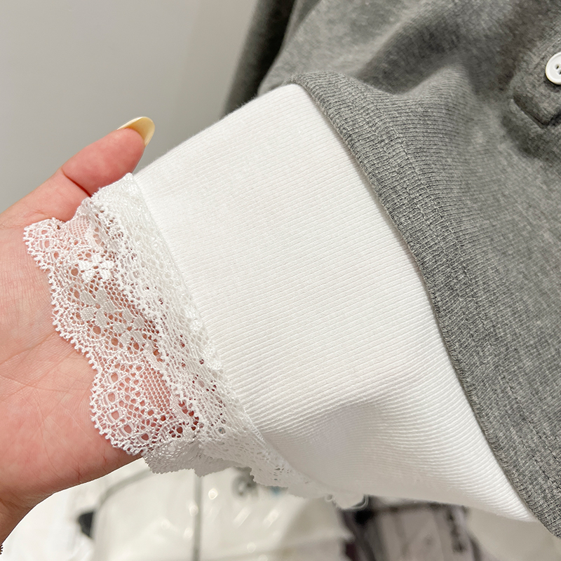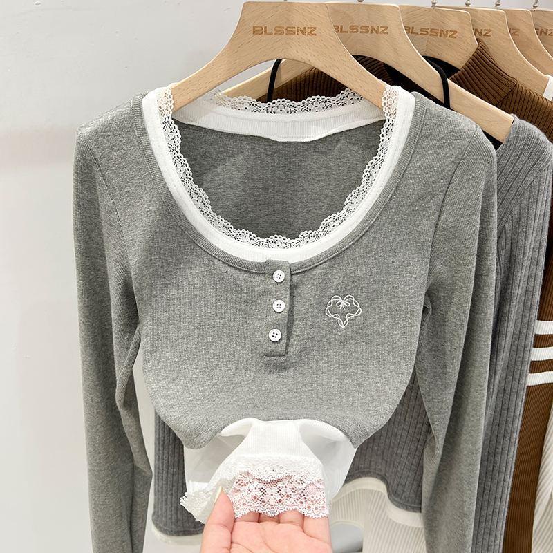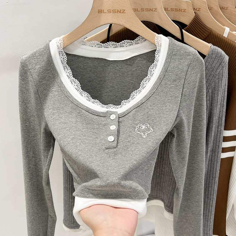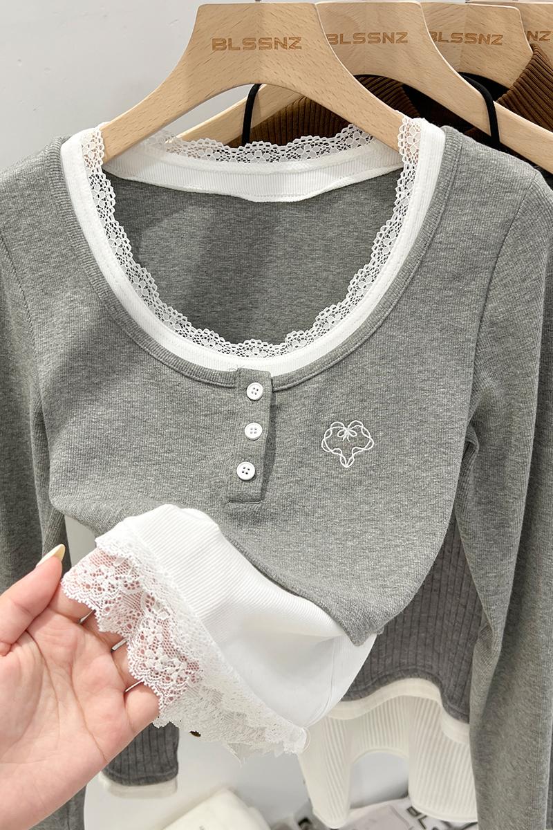 Real Price Real Shot #Grey Lace 가짜 2 피스 어깨 u 넥 긴팔 티셔츠 여자 스프링베이스 셔츠 짧은 탑