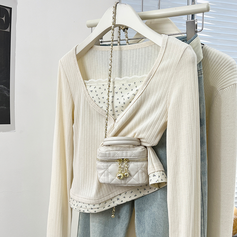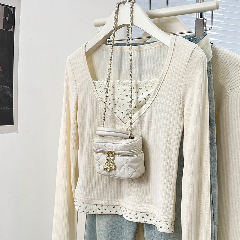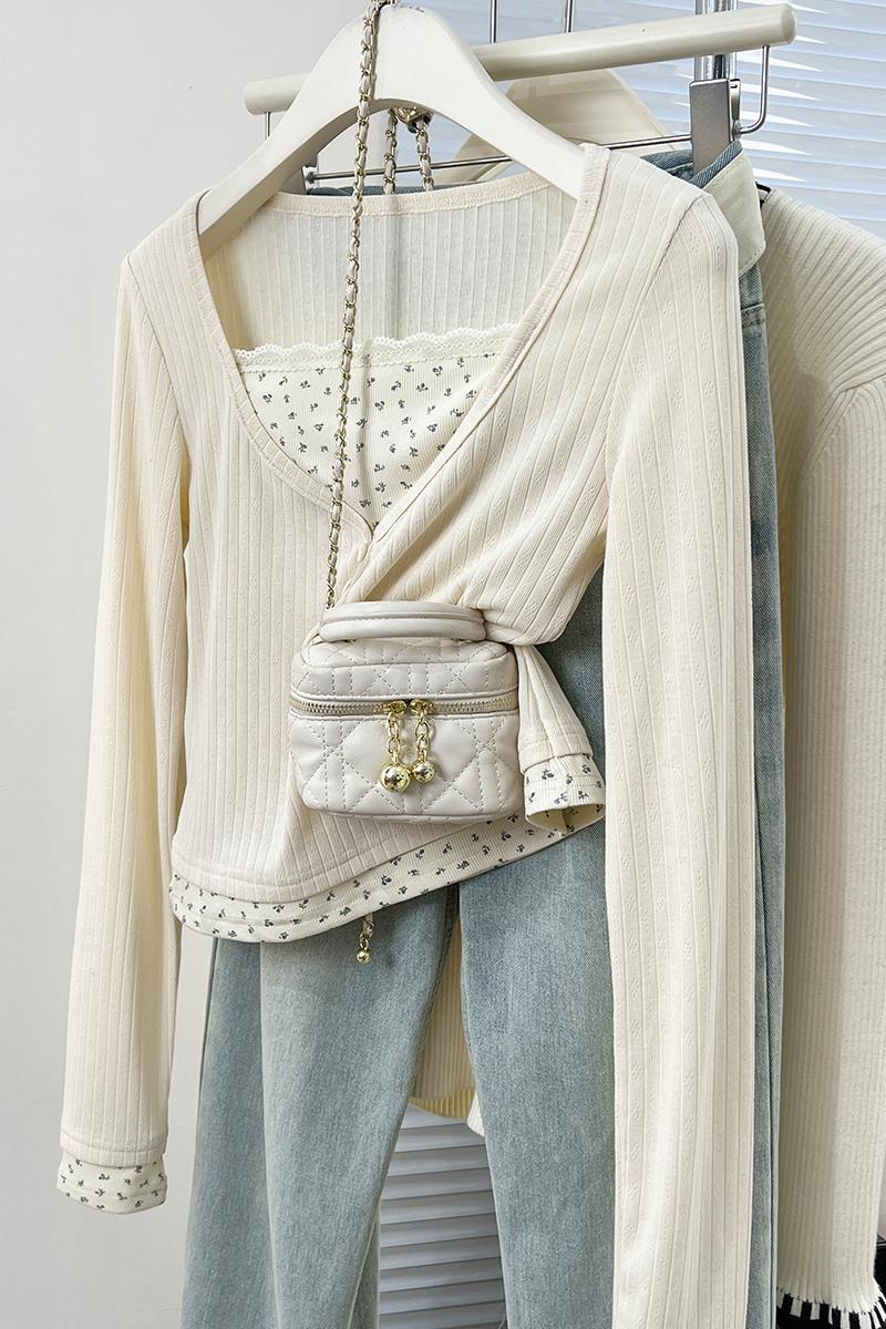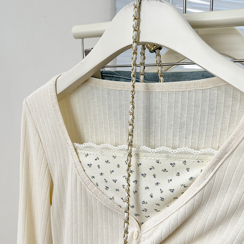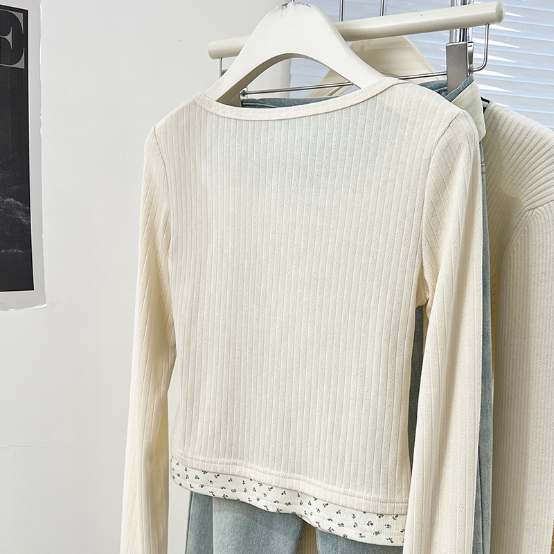 Real Price Real Shot #Floral 가짜 2 피스 봄과 가을베이스 셔츠에서 여성을위한 긴팔 티셔츠 순수하고 독특하고 매운 짧은 탑