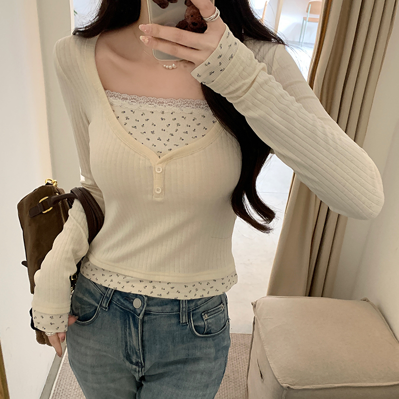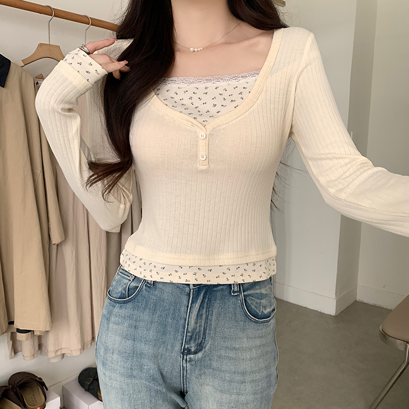 Real Price Real Shot #Floral 가짜 2 피스 봄과 가을베이스 셔츠에서 여성을위한 긴팔 티셔츠 순수하고 독특하고 매운 짧은 탑
