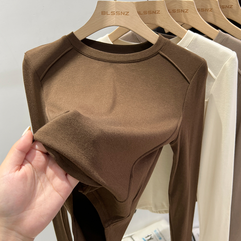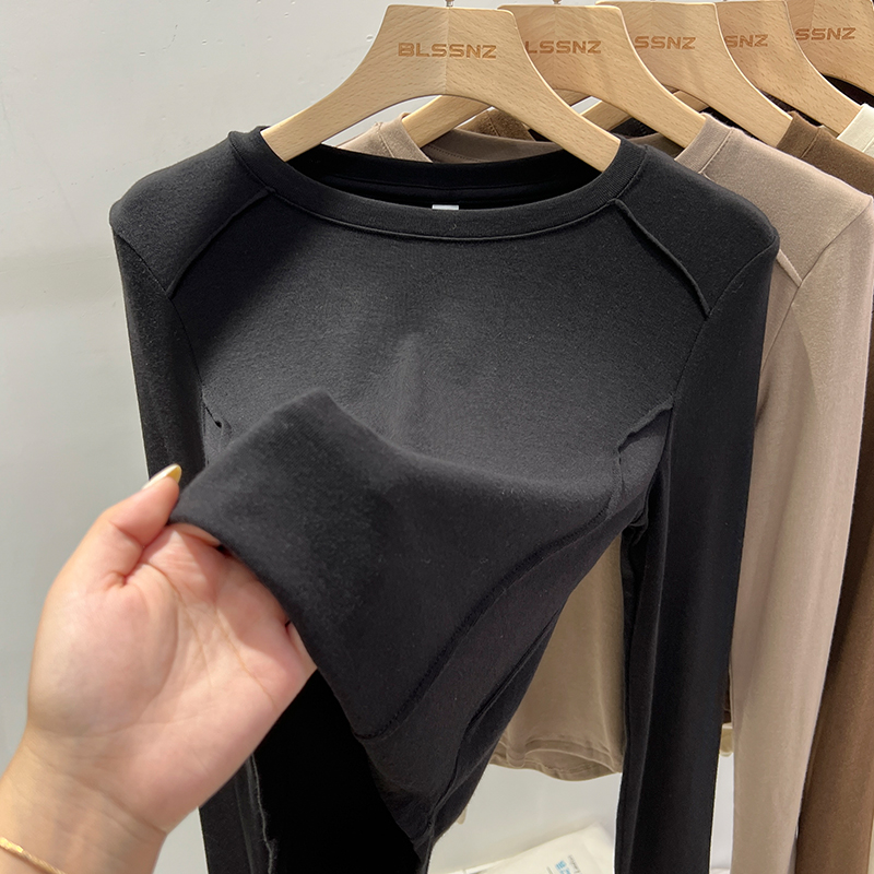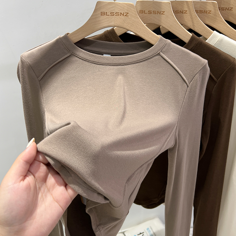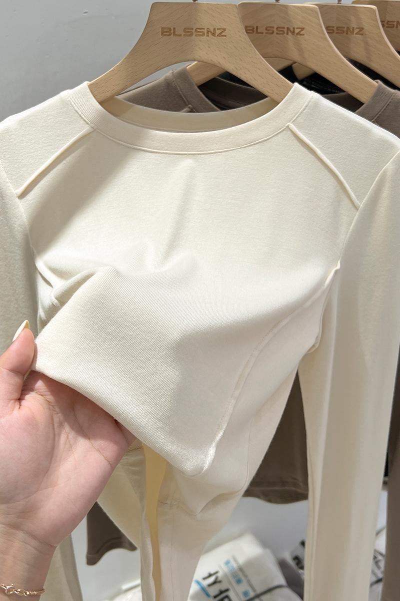 Real-Price Real Shot # 봄과 가을 디자인의 여성을위한 불규칙 어깨 긴팔 티셔츠 틈새 틈새 기본 셔츠 속옷