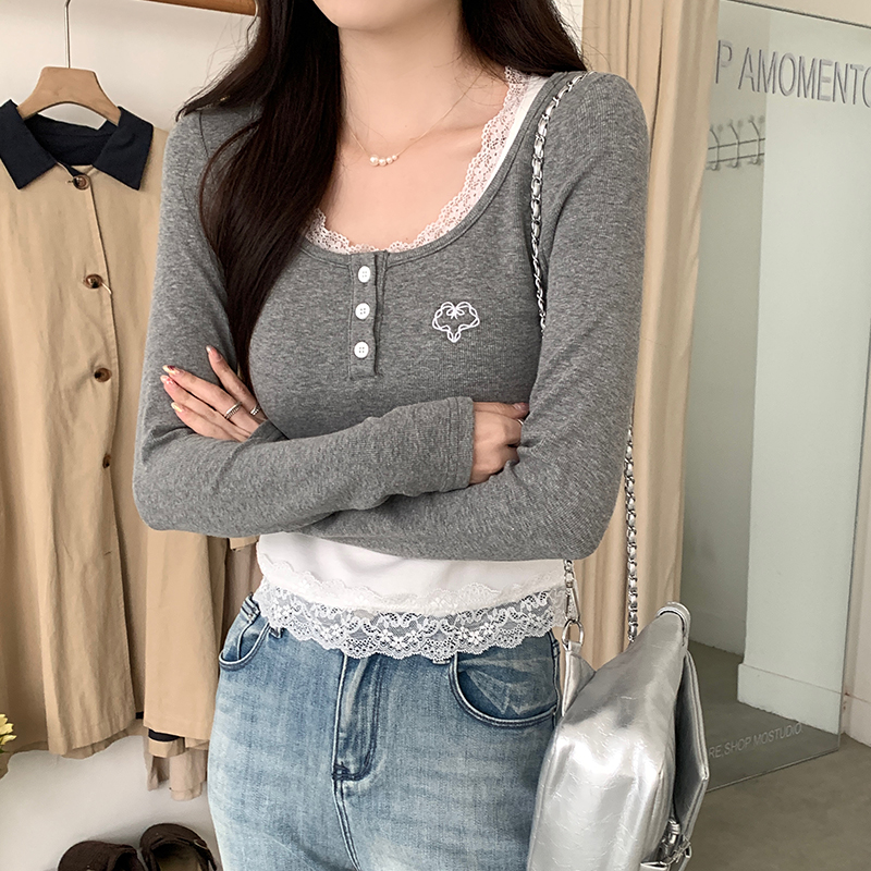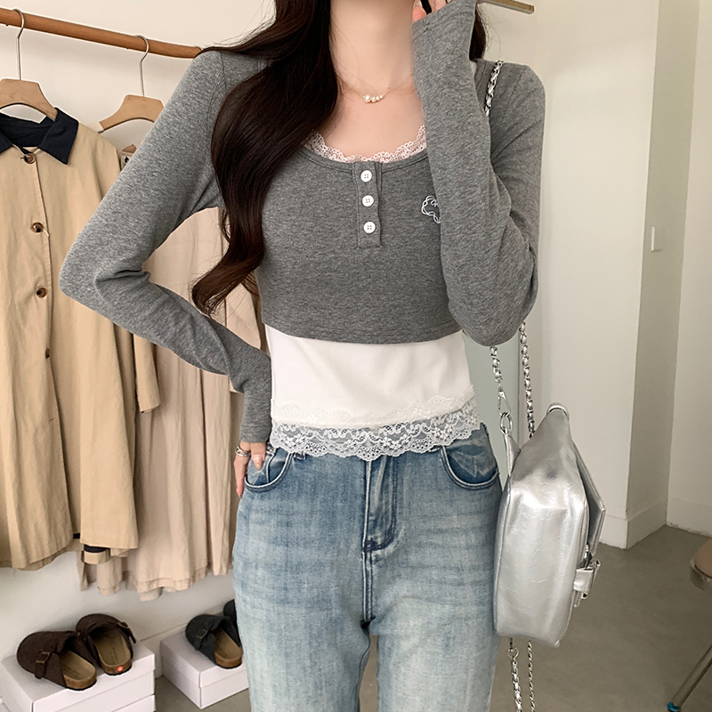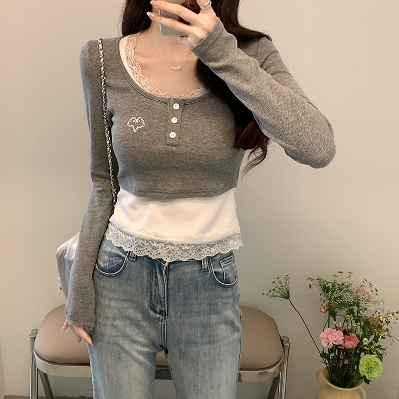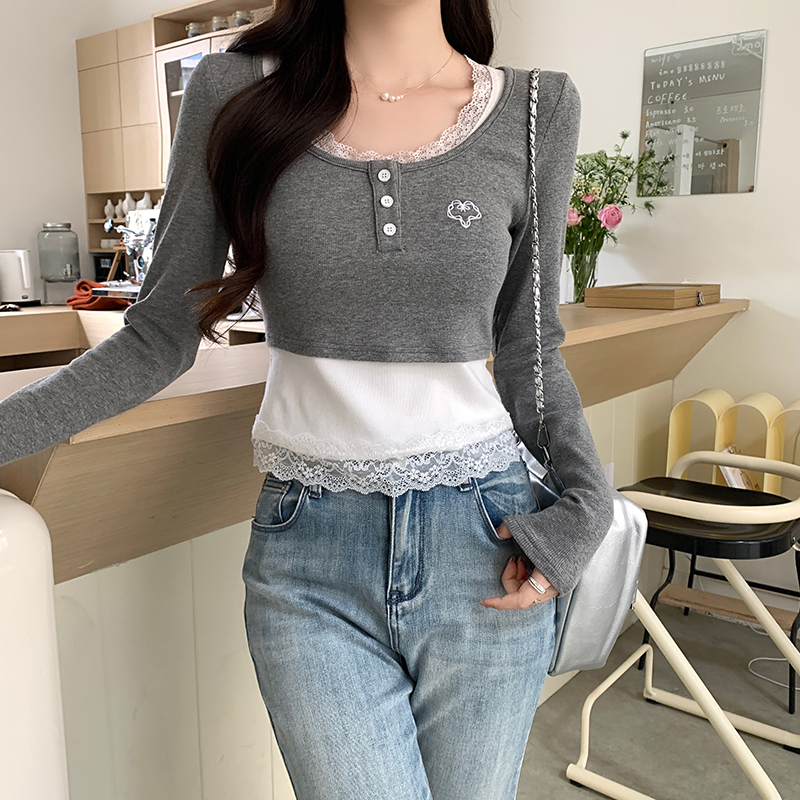 Real Price Real Shot #Grey Lace 가짜 2 피스 어깨 u 넥 긴팔 티셔츠 여자 스프링베이스 셔츠 짧은 탑