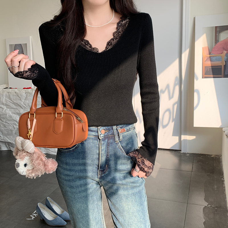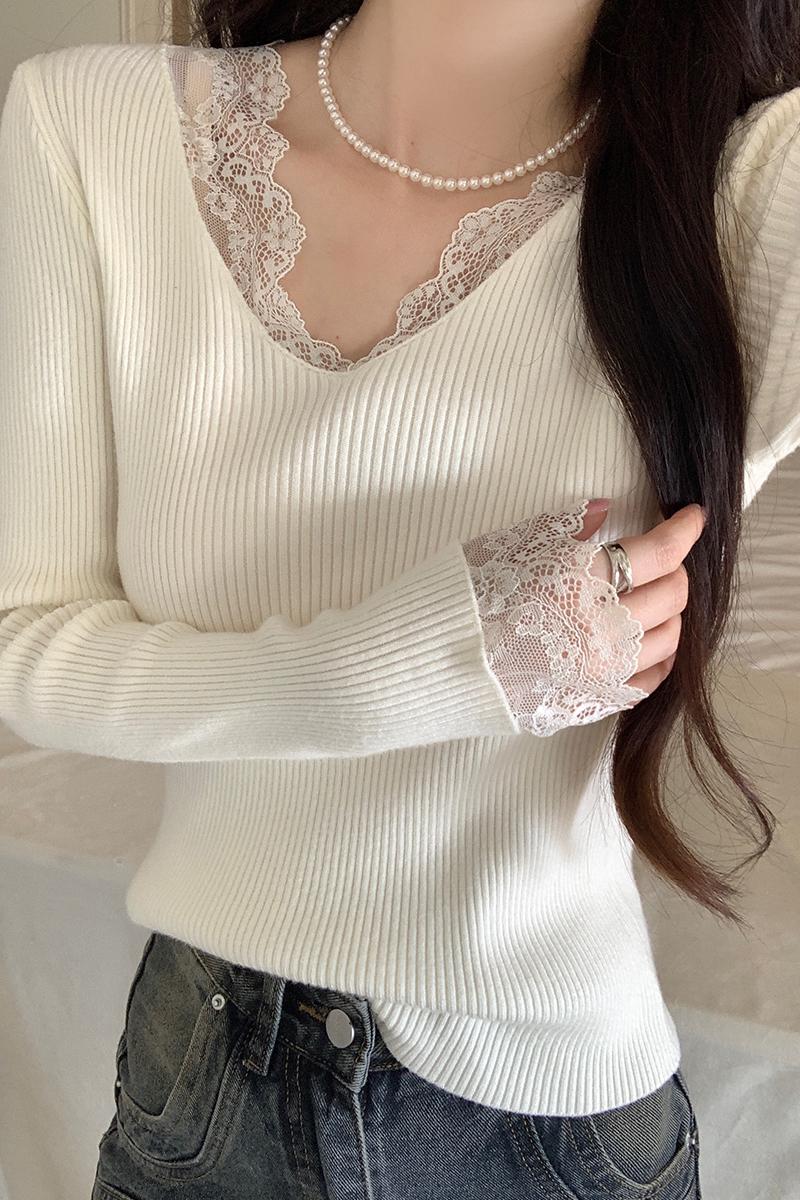 실제 가격 실제 촬영 #EUROPEAN APRICOT V-NECK베이스 셔츠 가을과 겨울 레이스 스웨터 긴팔 스웨터를 가진 여성을위한 여성
