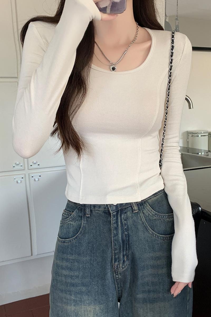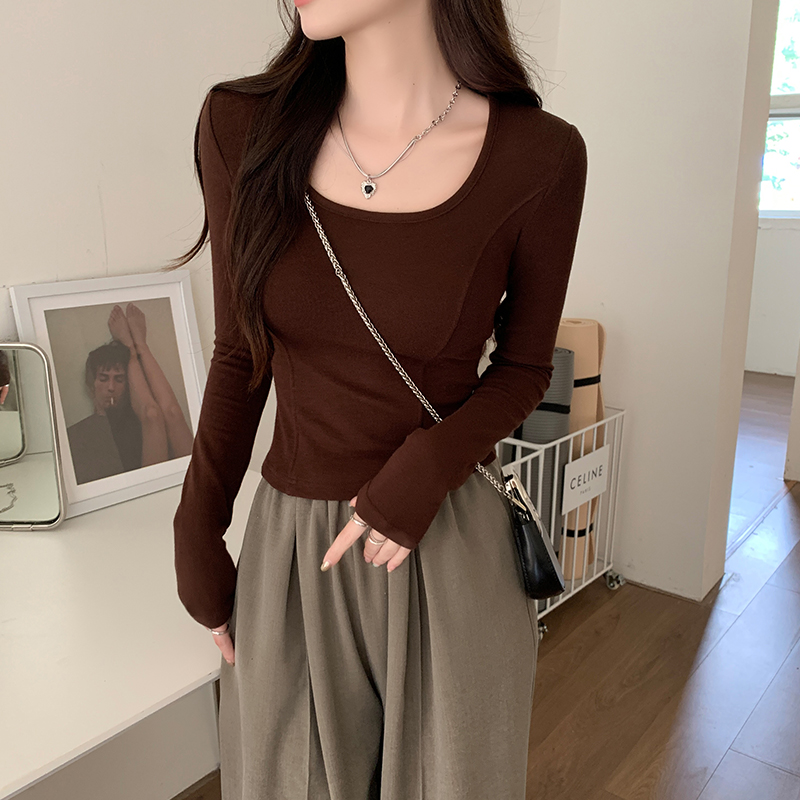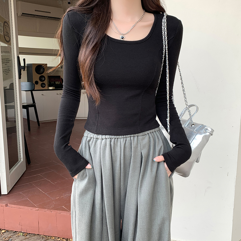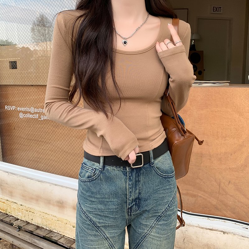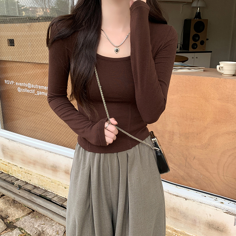 Real-Price Real Shot #INNER 스레드베이스 셔츠 세련된 슬림 핏과 섹시한 쇄골 사각형 칼라 탑 드로 스트링 긴 슬리브 티셔츠를 가진 여성