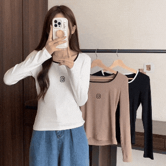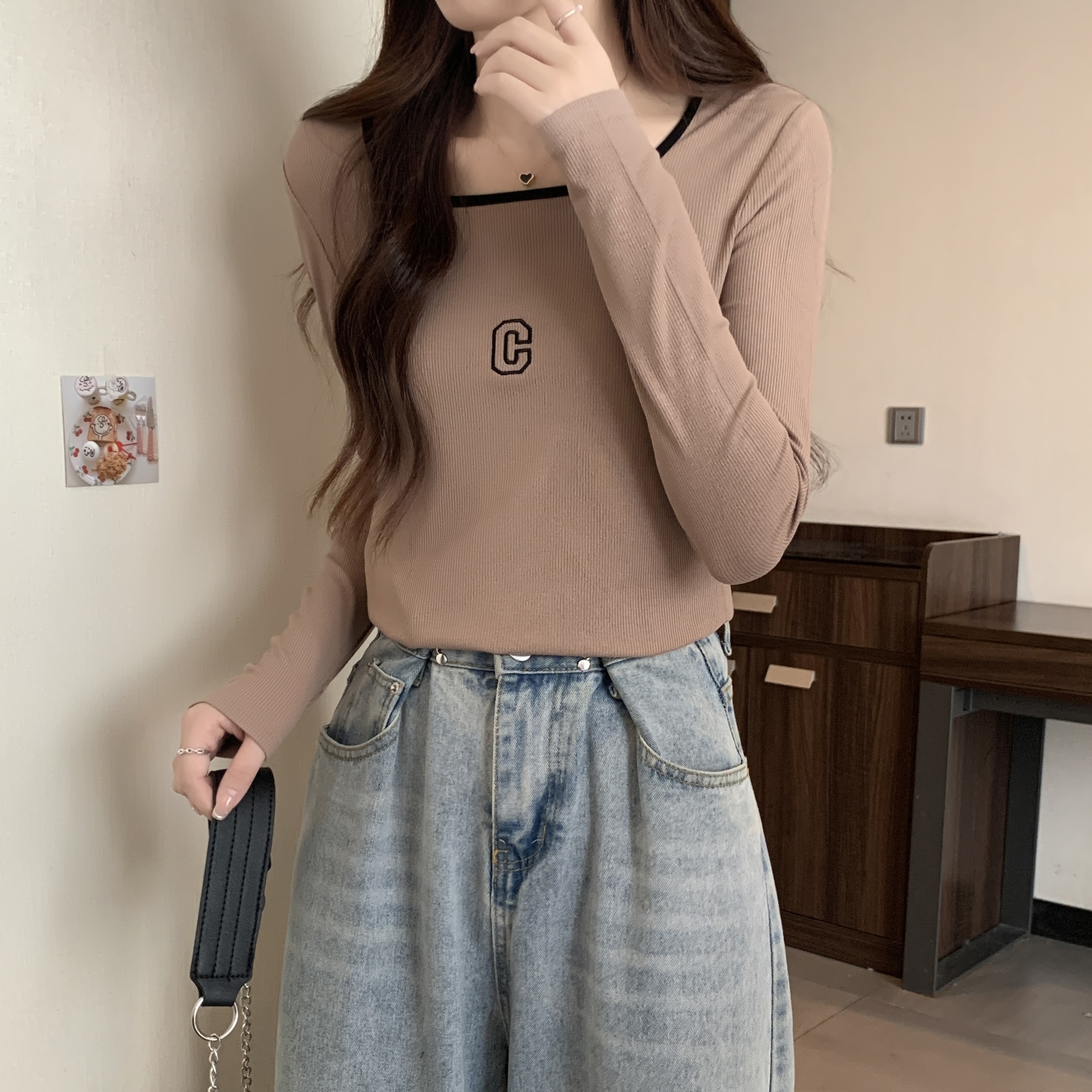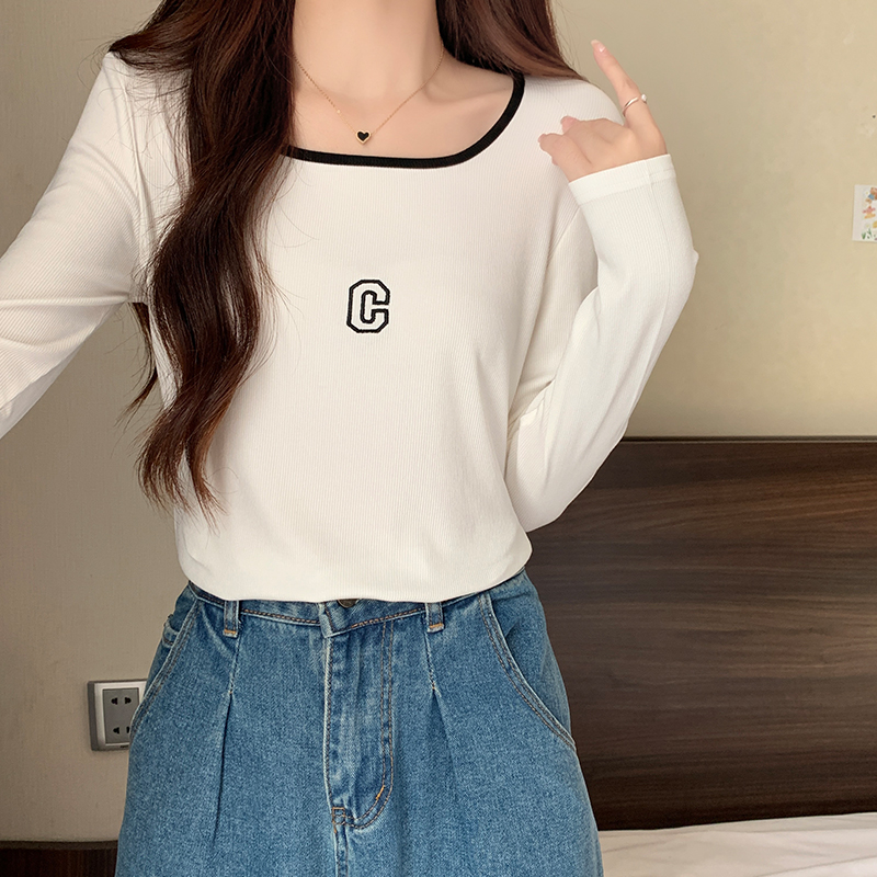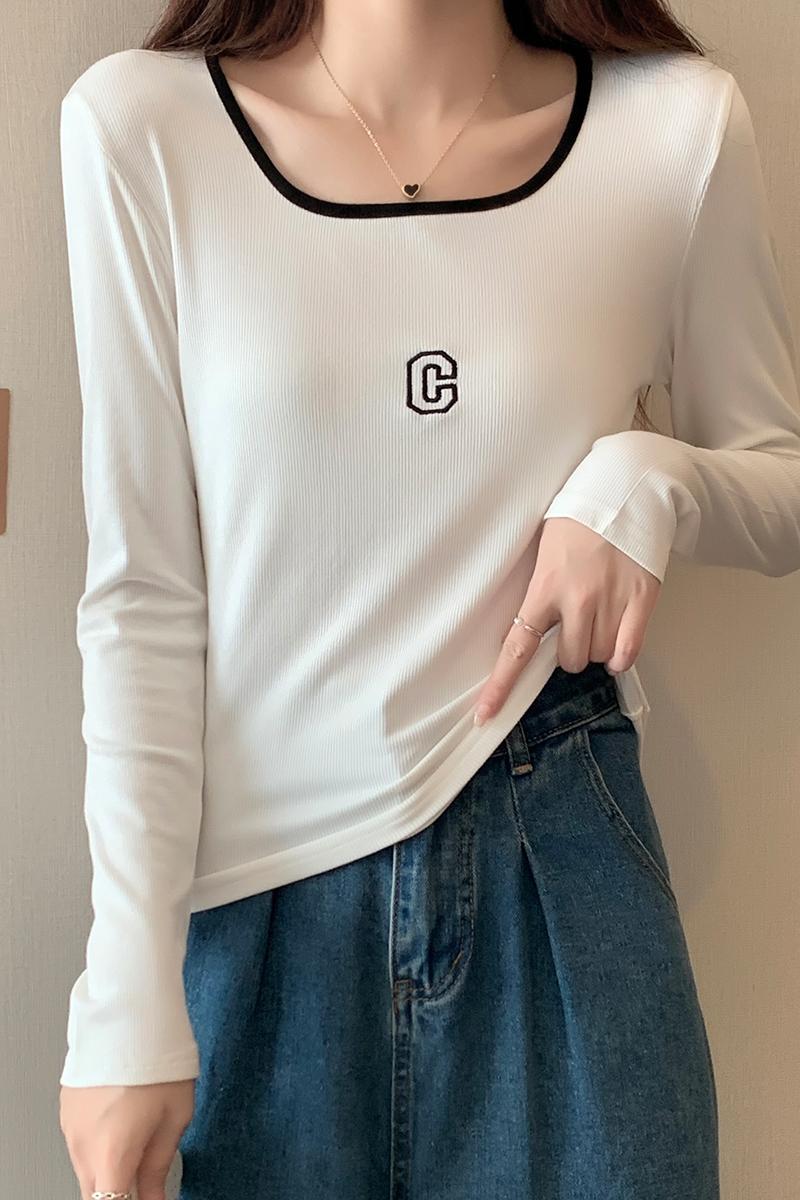 나사산 긴팔 티셔츠 이른 가을 새로운 쇄골 고급 스퀘어 칼라 탑베이스 셔츠 트렌디