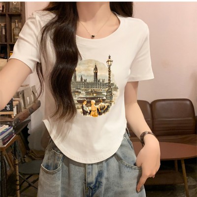 어깨 단락 티셔츠 고급 곡선 밑단 짧은 슬림 하이 허리와 배꼽 핫 걸 탑을 가진 여성