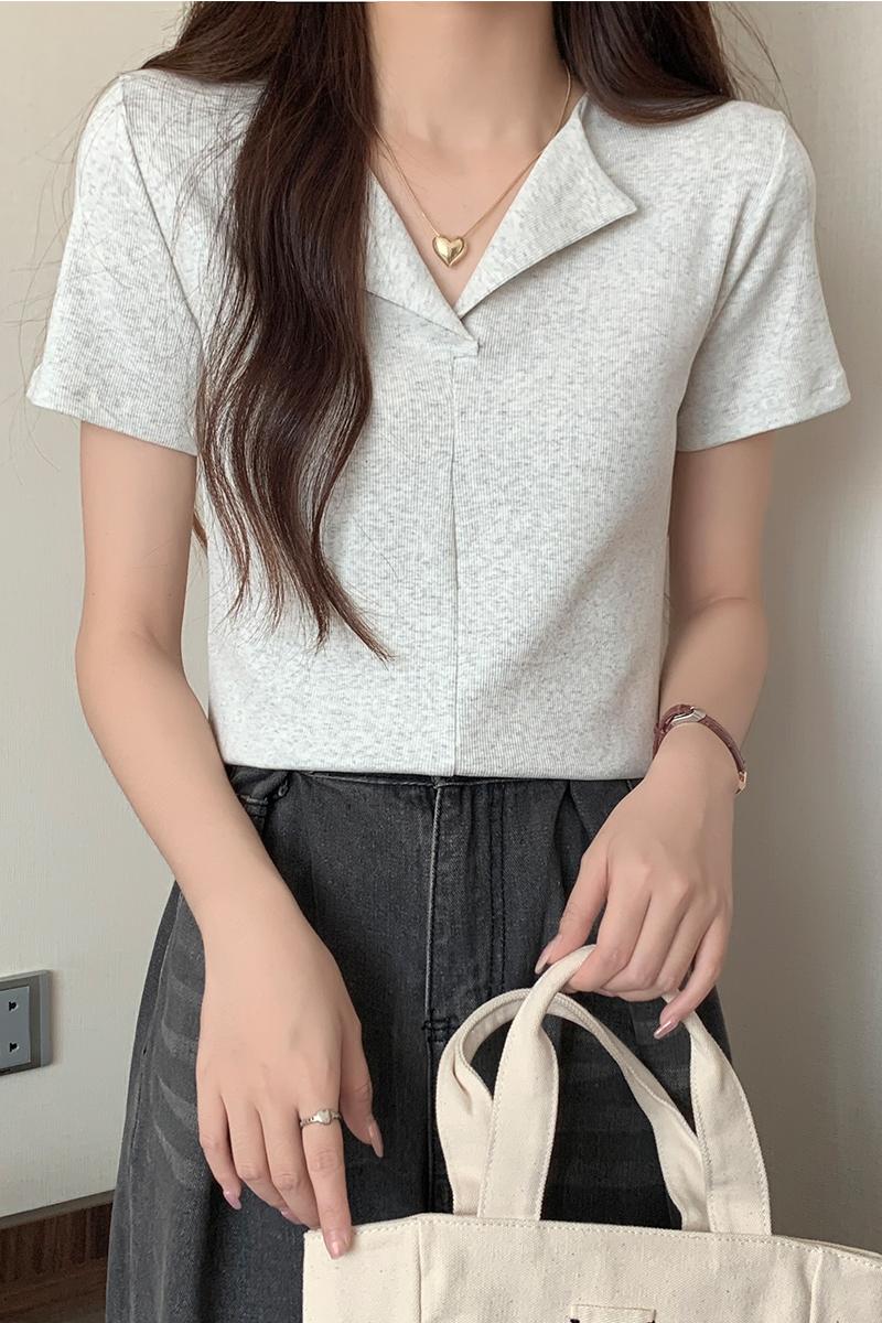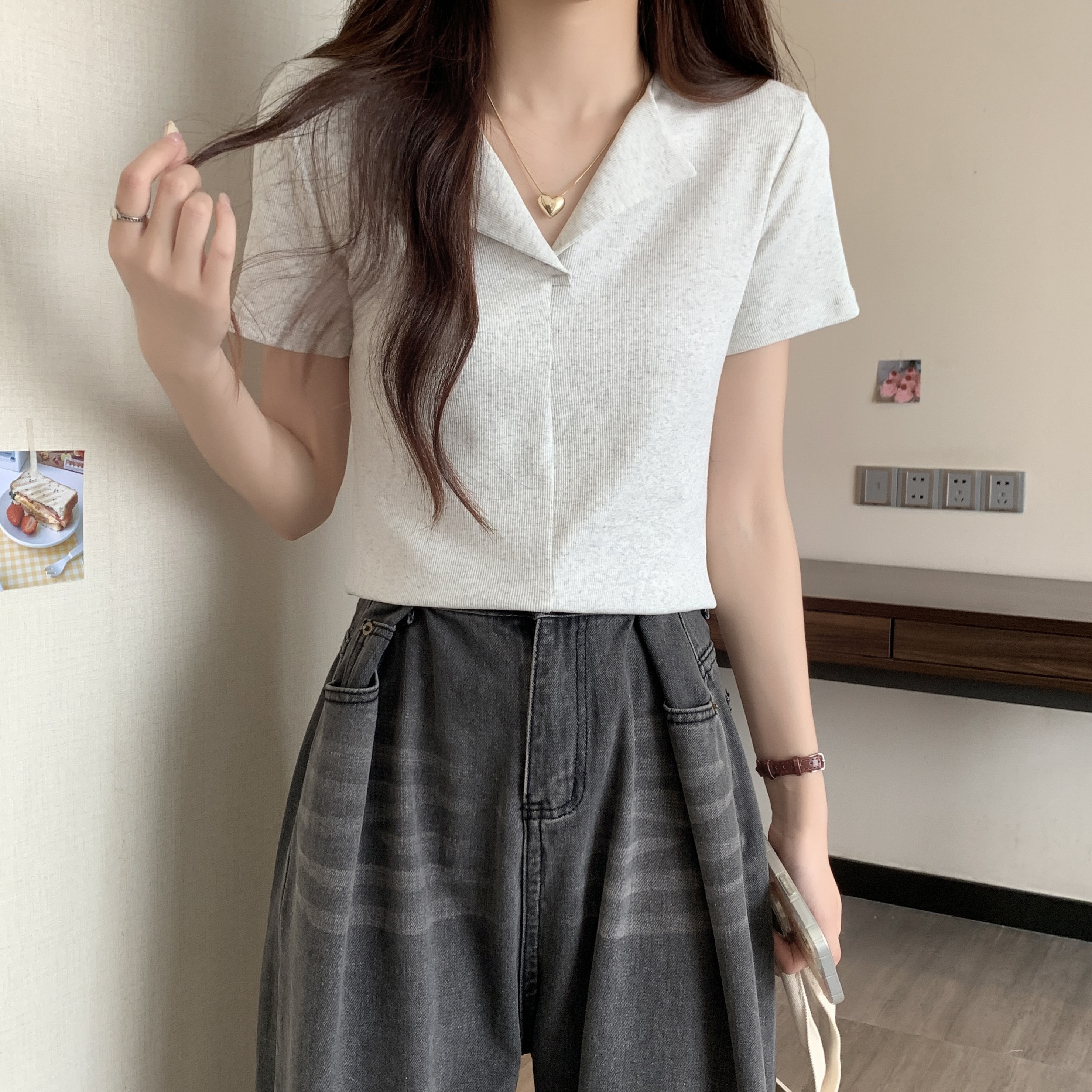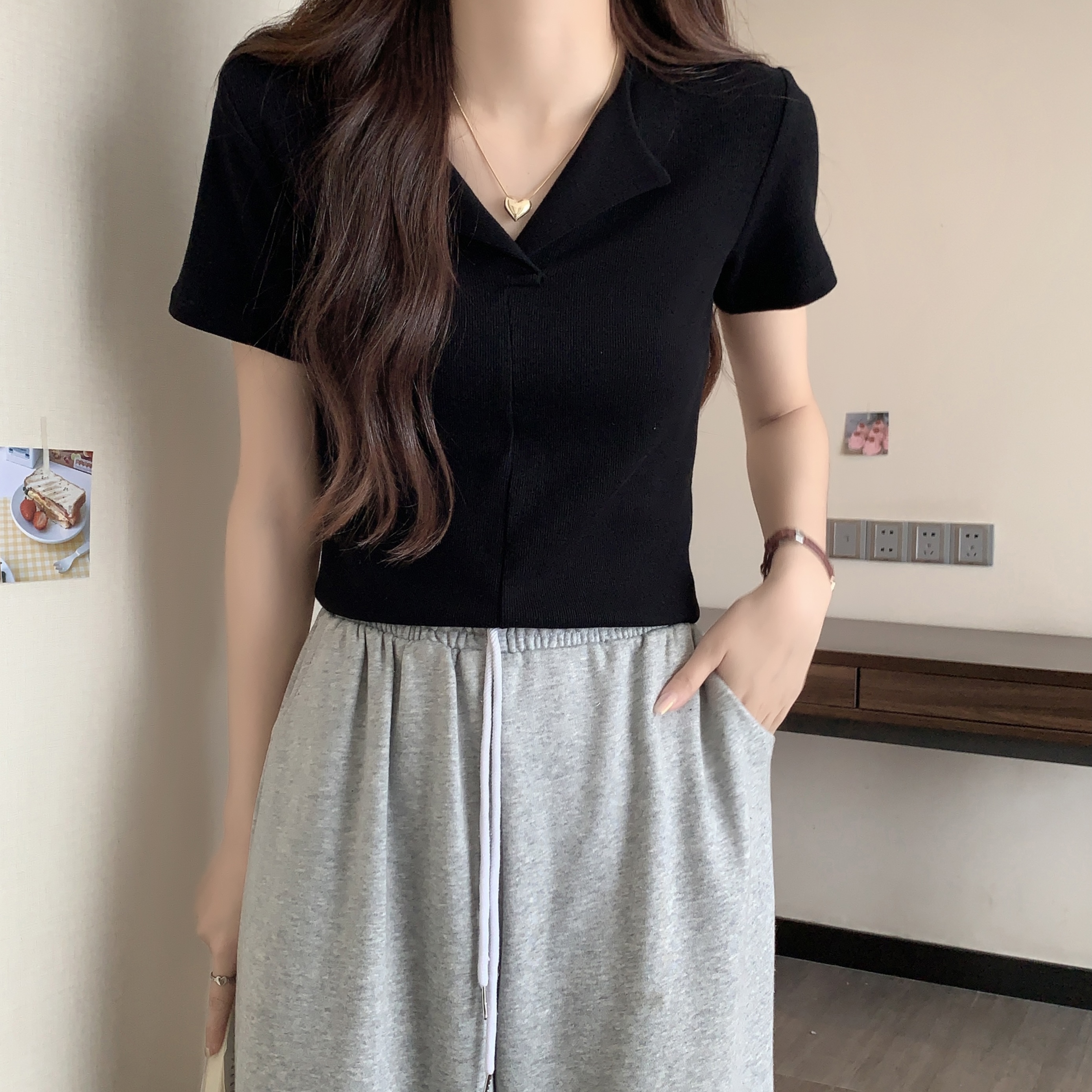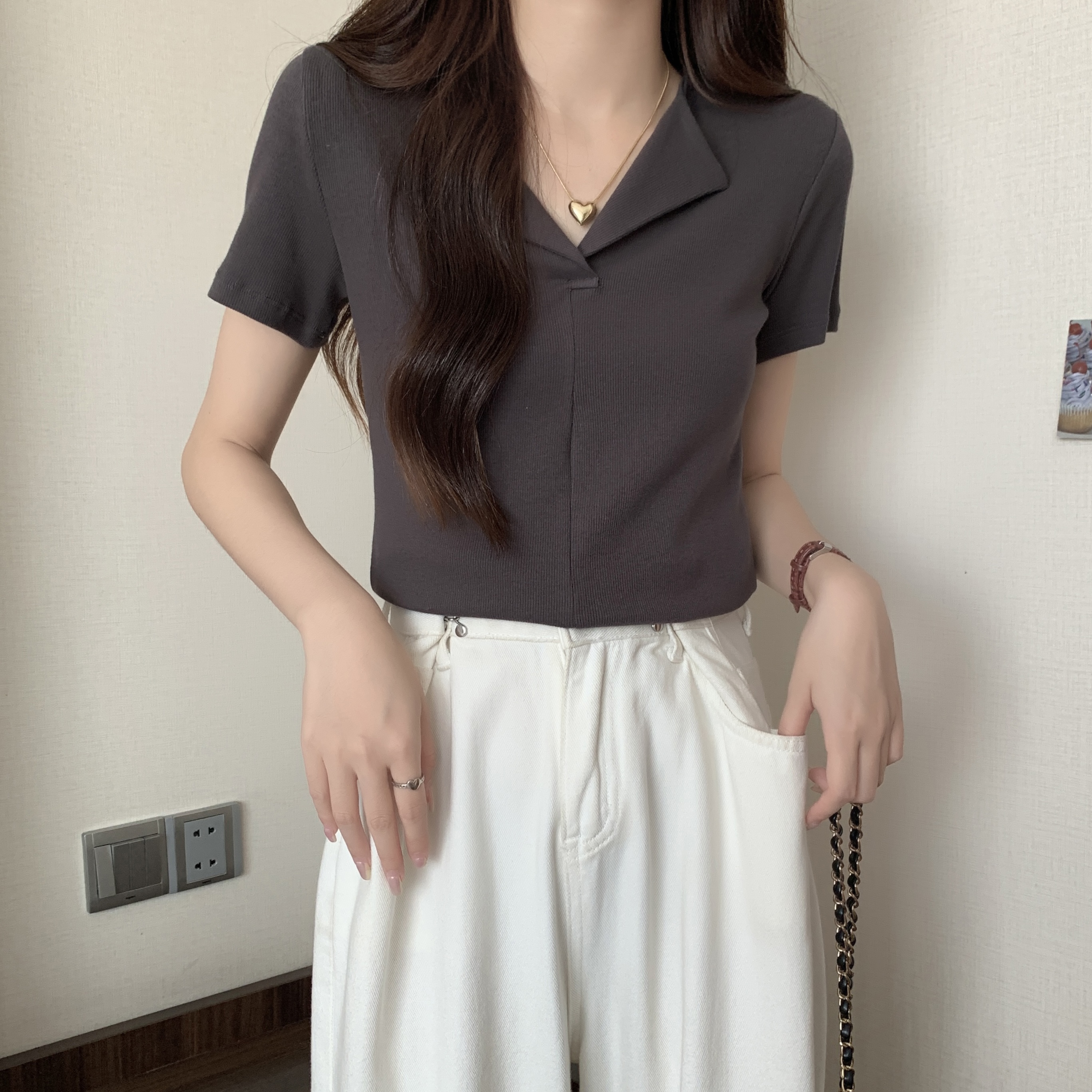 v 넥 티셔츠 단락 독특한 옷깃 여름 정장 여성을위한 새로운 쇄골 슬림 바디 의류