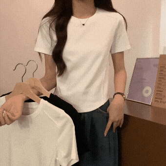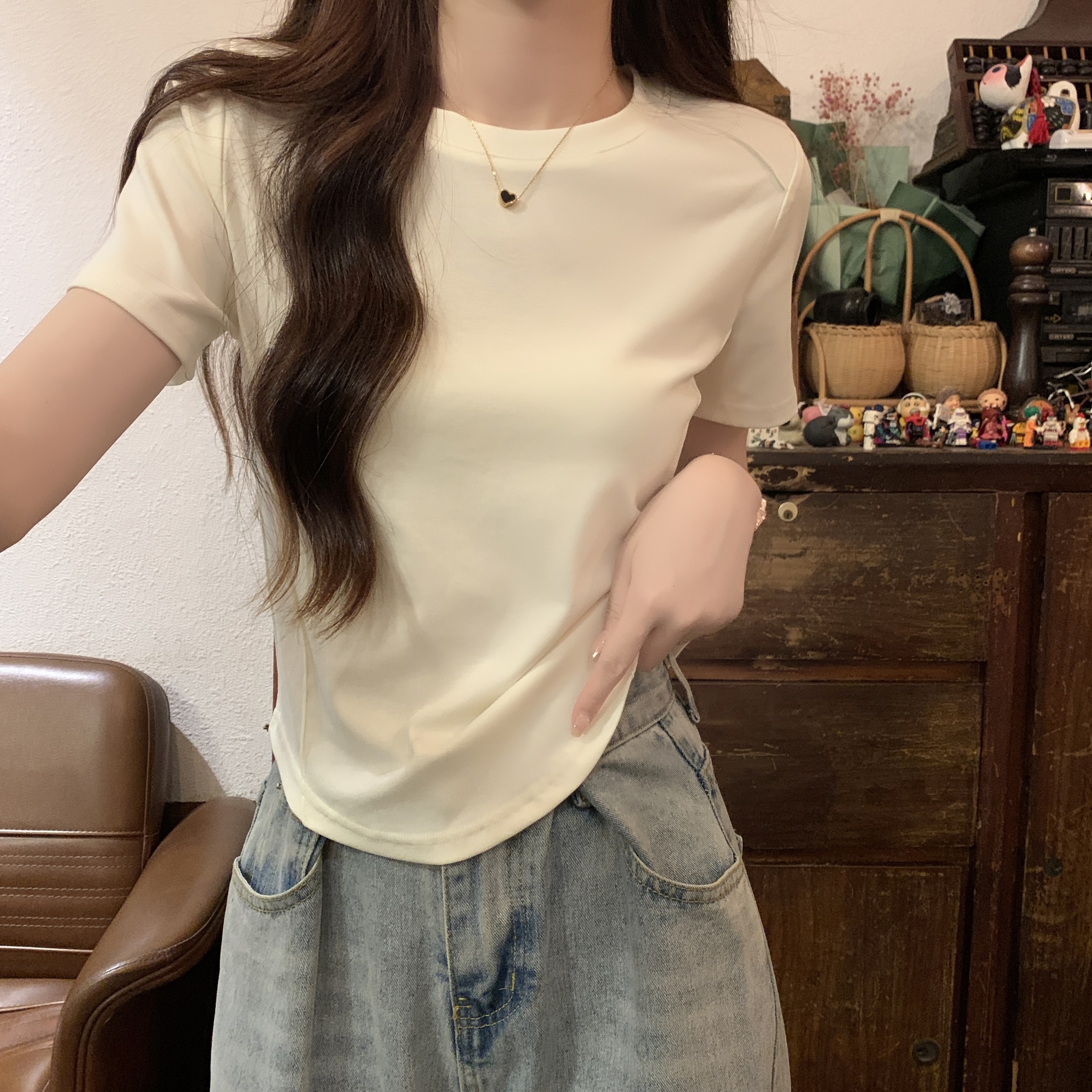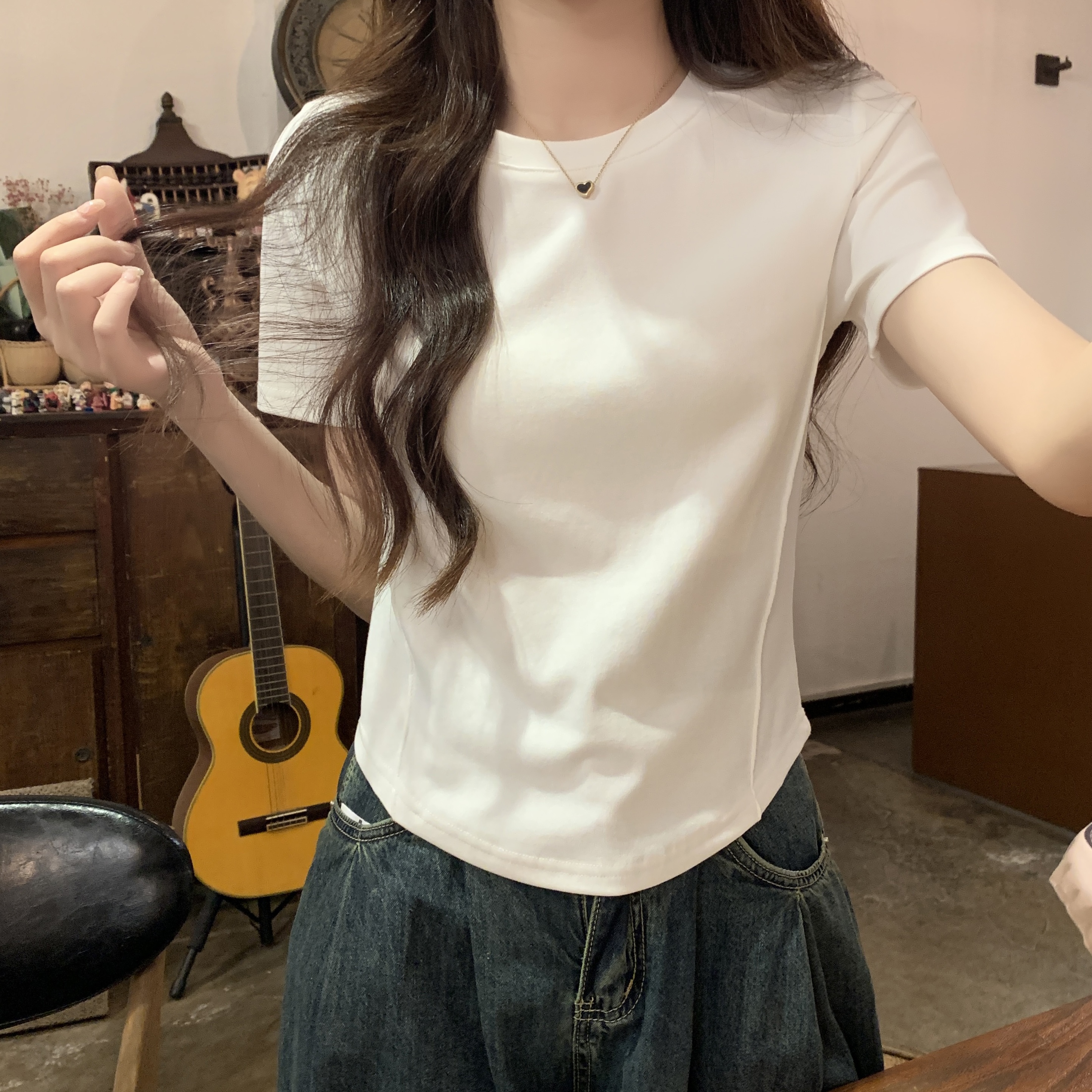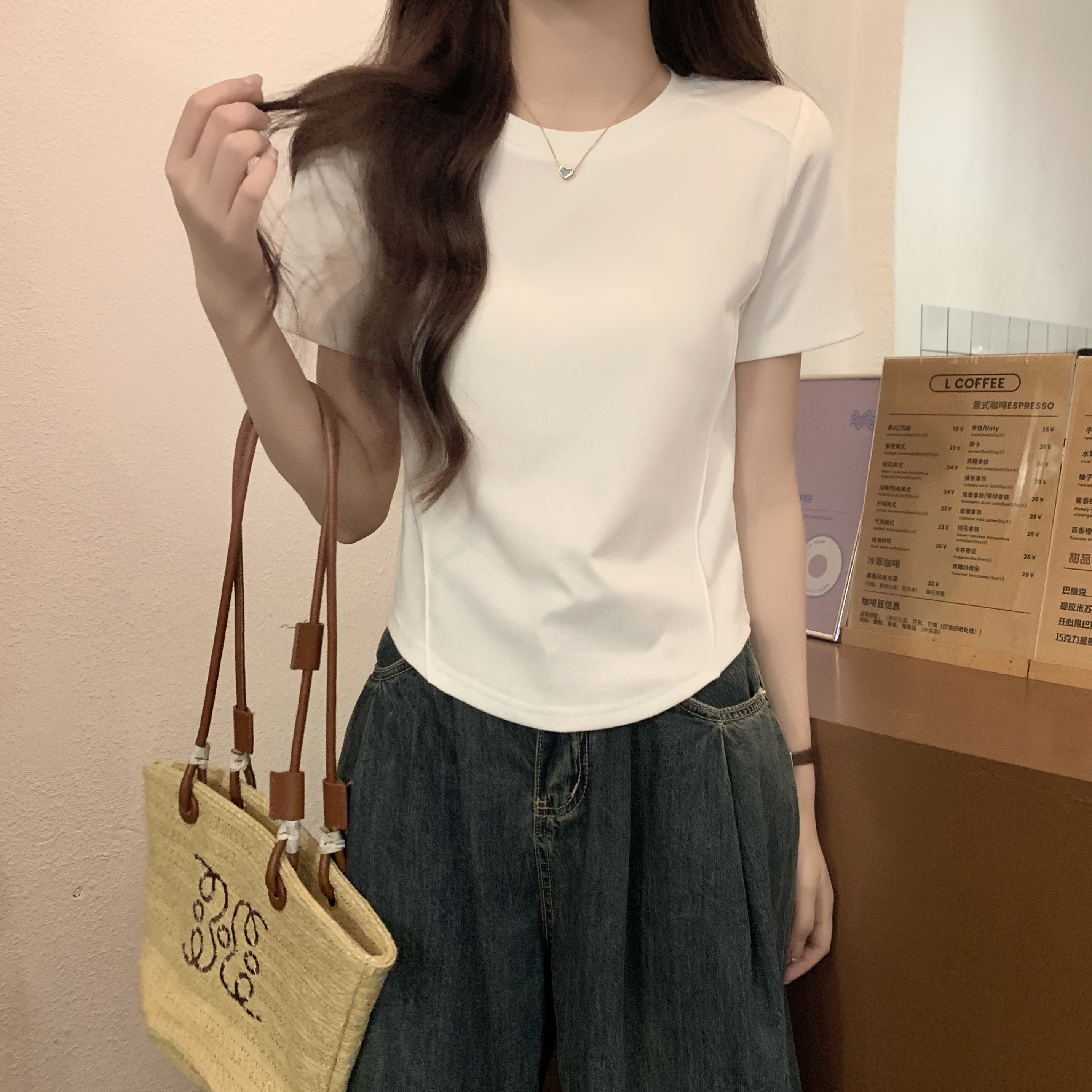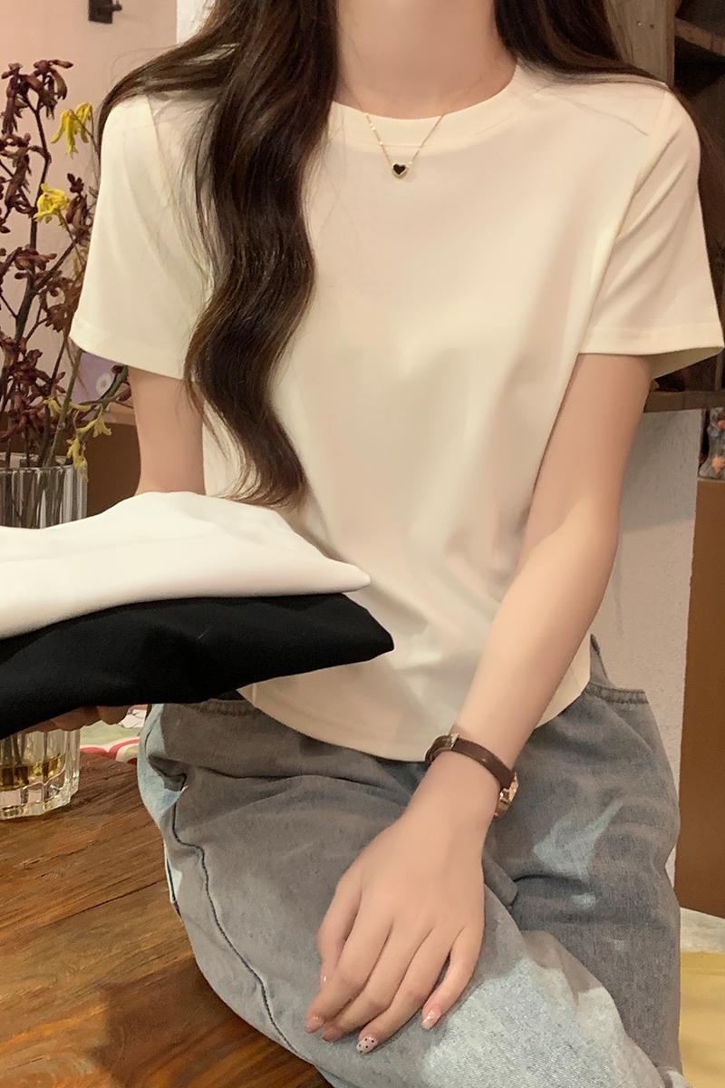 짧은팔 티셔츠 여자 여름 새로운 다재다능한 순수면 어깨 티셔츠 화이트 둥근 목 새 상단