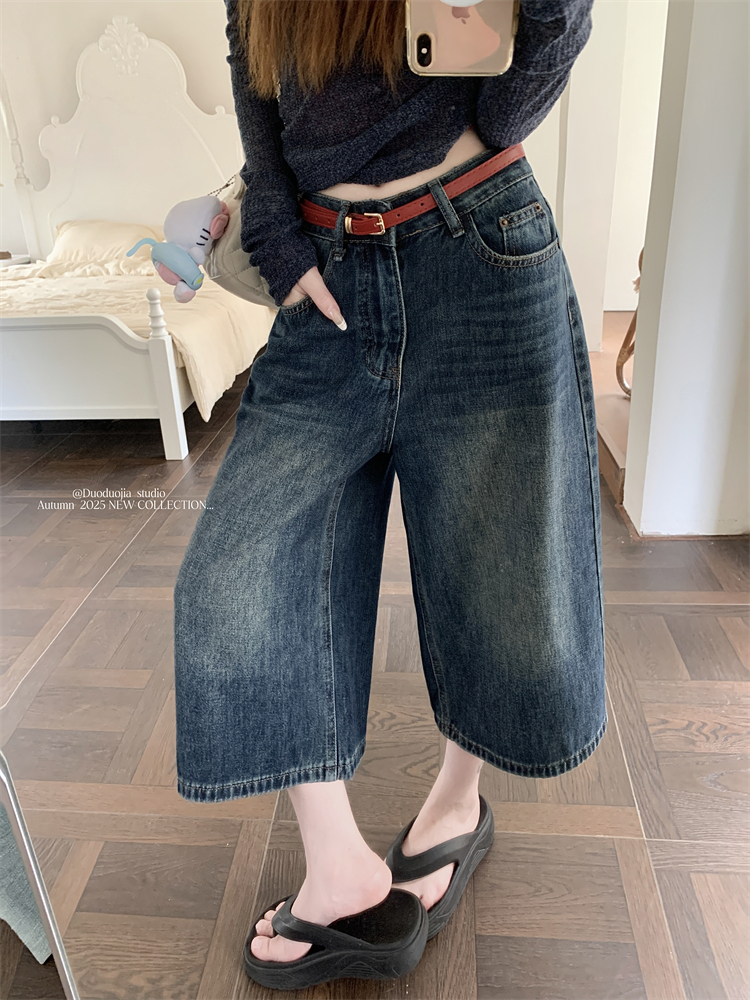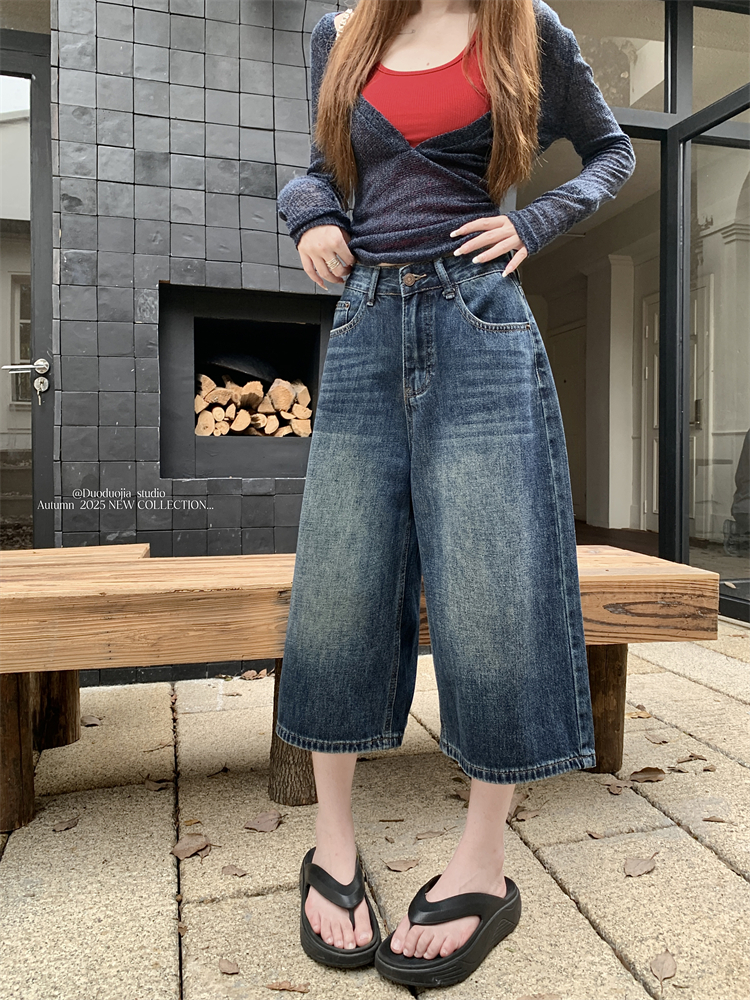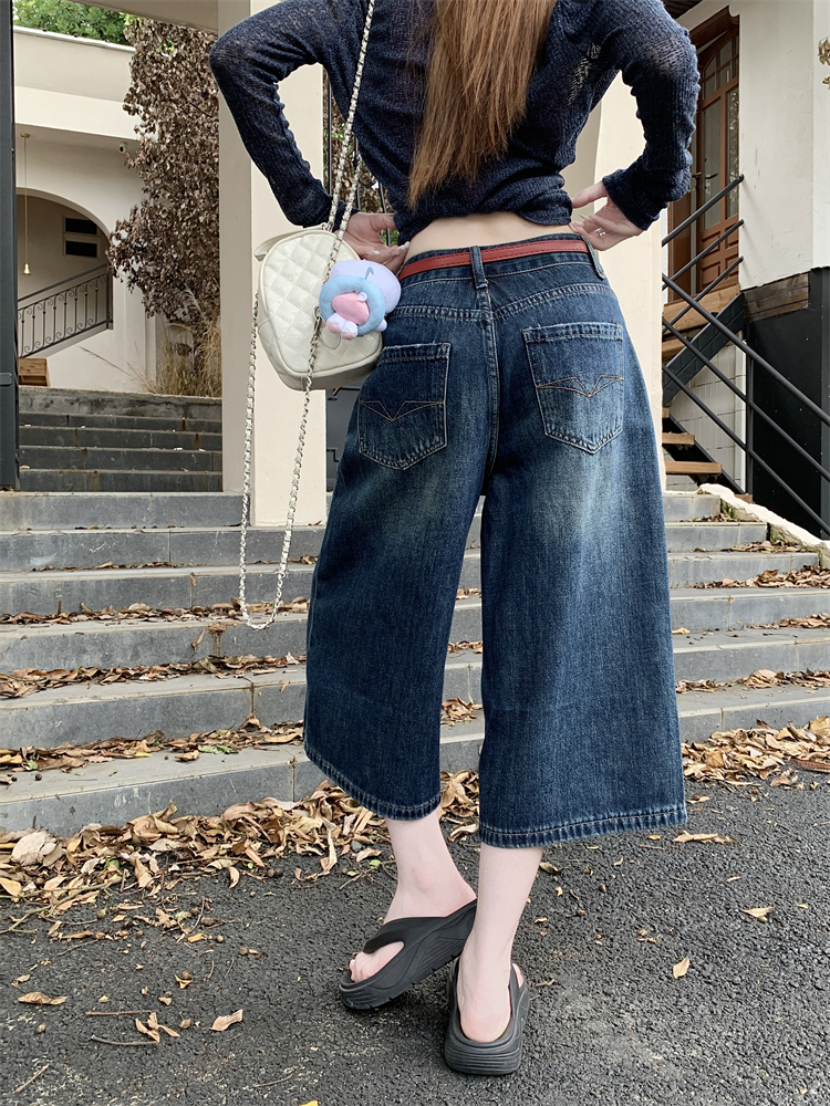 여성의 새로운 하이 웨이스트 다용도 직선형 미드 바지 바지를위한 실제 미국 레트로 세척 자수 넓은 레그 7 크롭 청바지