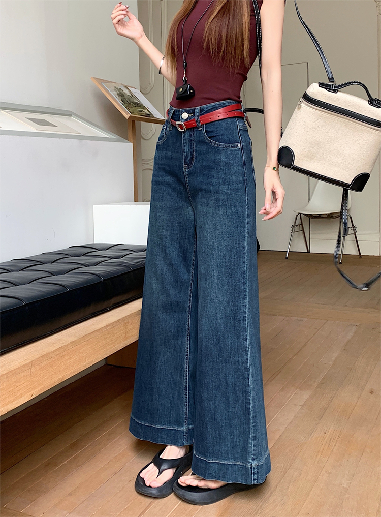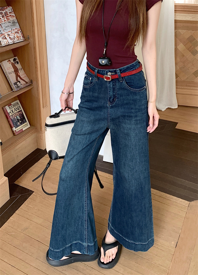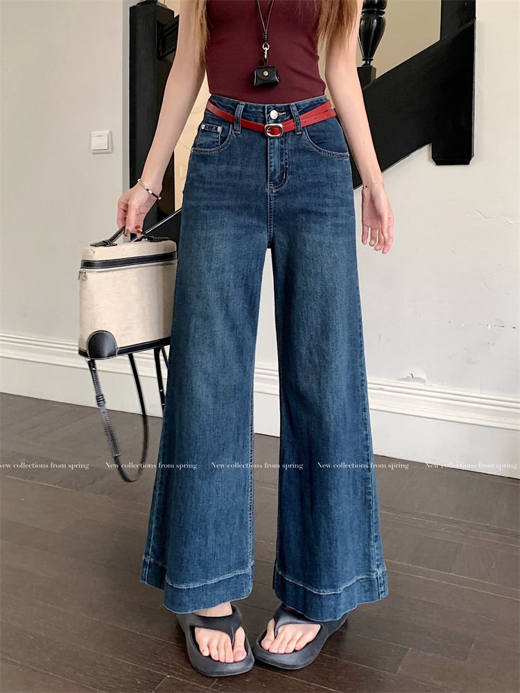 Real Shot, Real Price ~ 여성의 새로운 하이 웨이스트 슬리밍 느슨한 플레어 스트레이트 레그 바지를위한 레트로 블루 와이드 레그 청바지
