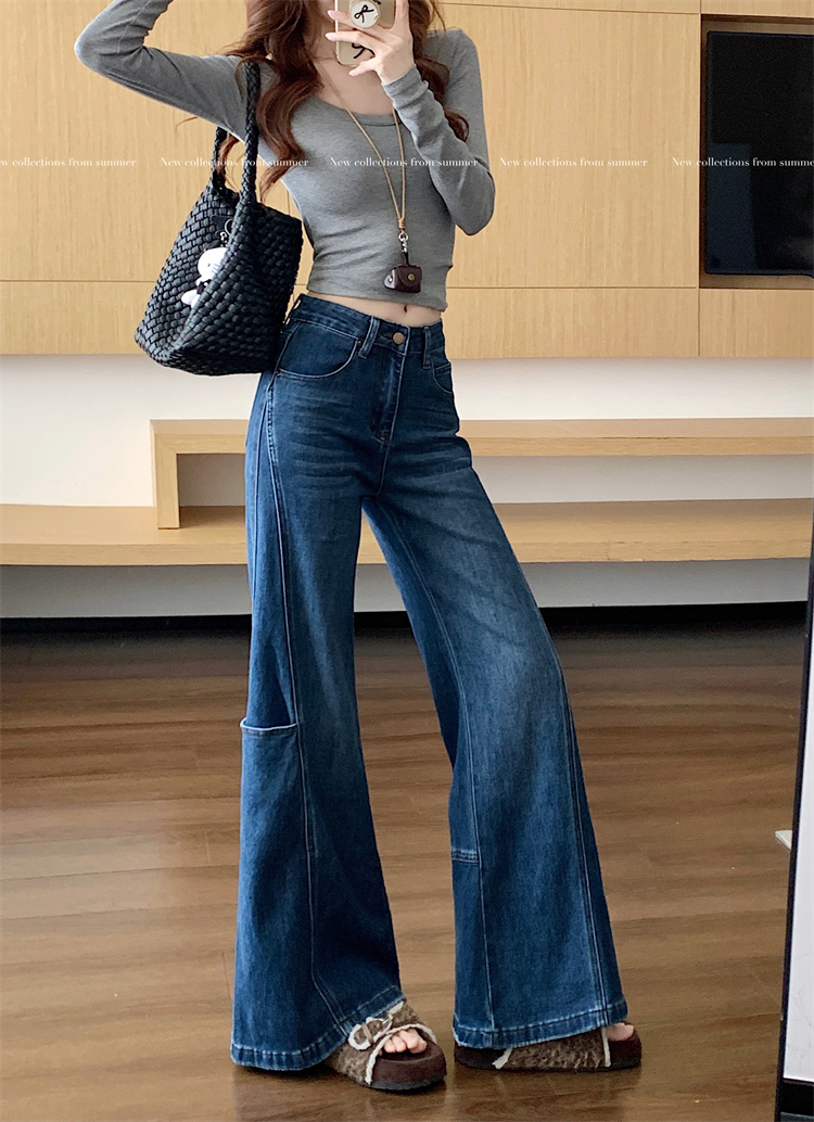 실제 샷, 실제 가격 ~ 미국 다목적 마이크로 플레어 청바지가 높은 허리 슬림 사이드 포켓 ​​디자인 플레어 바지를 가진 여성을위한 청바지