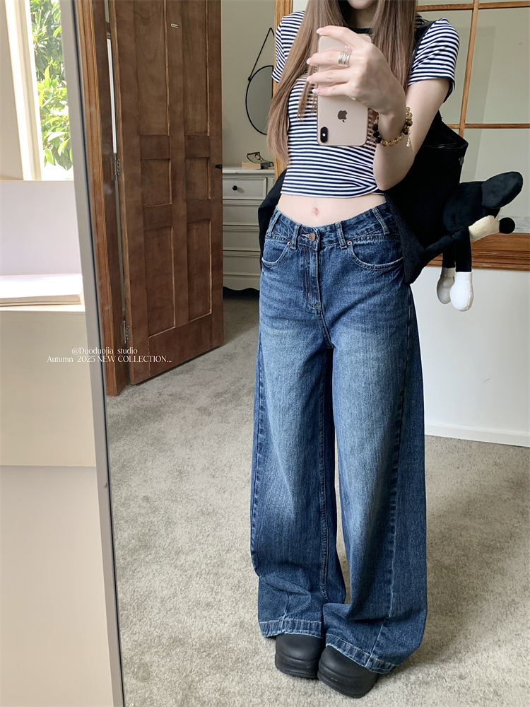 가을에 여성을위한 실제 가격이 책정 된 미국 레트로 세척 넓은 부정형 청바지 새로운 하이 웨이스트 슬리밍 직선 바닥 바지