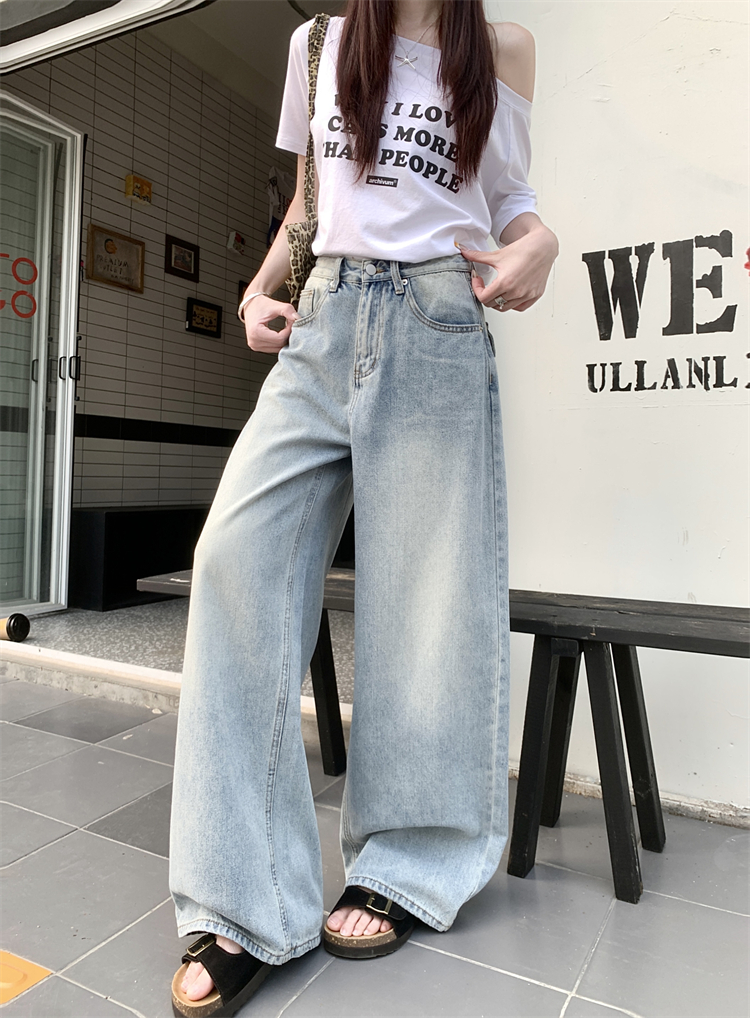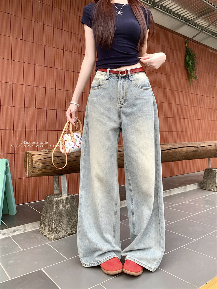 Real Shot, Real Price ~ 여성의 새로운 Blue High-Waist Looke Straight-Leg 바지를위한 American Retro Wide Leg Jeans