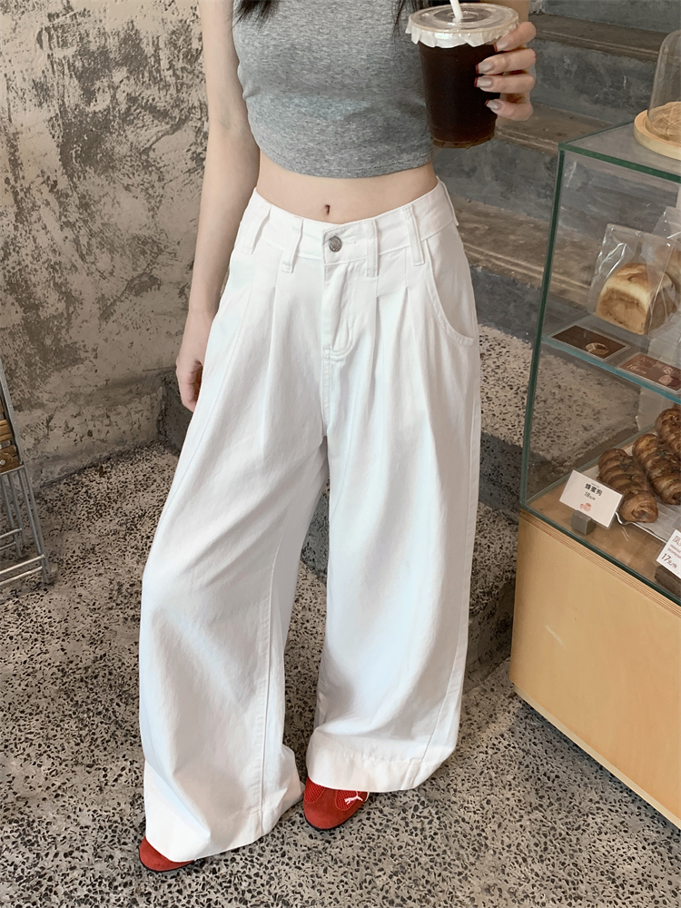 여름에 여성을위한 실제 가격이 책정 된 미국 화이트 청바지 새로운 하이 웨이스트 느슨한 넓은 다리 직선 바닥 바지
