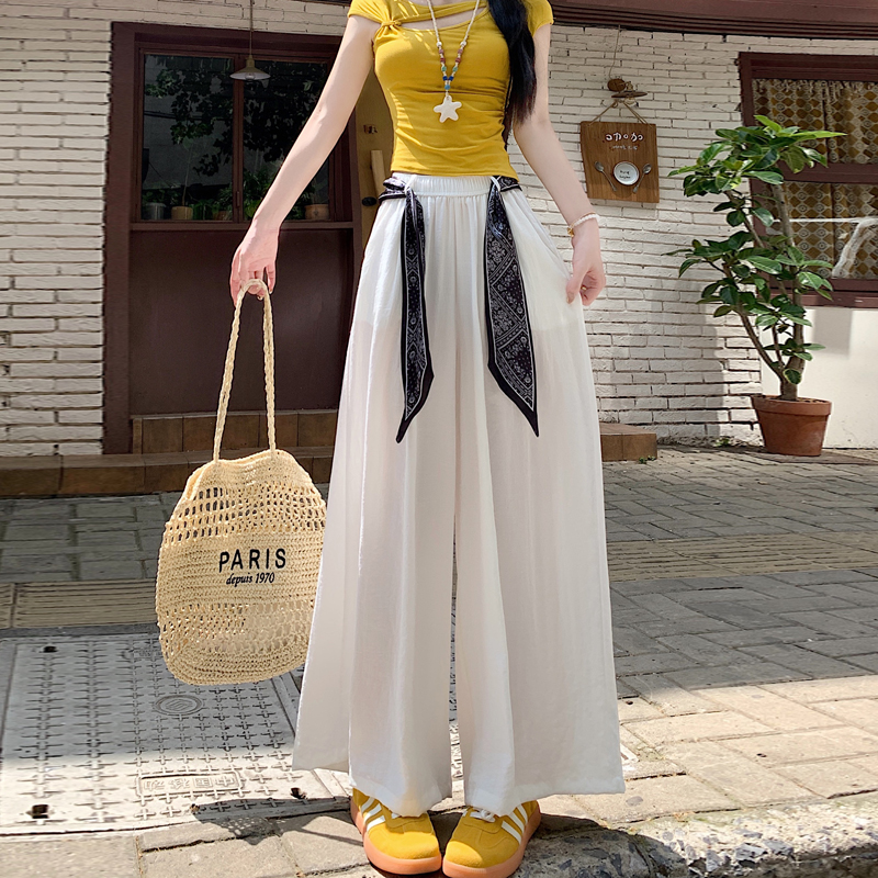 Real Shot, Real Price ~ Ice Silk Cotton 및 Linen은 여성의 새로운 하이 웨이스트 슬림하고 느슨한 스트레이트 레그 캐주얼 9 포인트 바지를위한 넓은 다리 바지를 인쇄합니다.