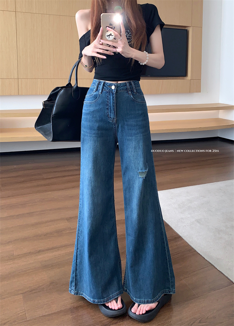 실제 가격이 책정 된 미국 복고풍 찢어진 청바지 여성 뜨거운 여자가 높은 허리 슬림 다목적 직선 바닥 바지