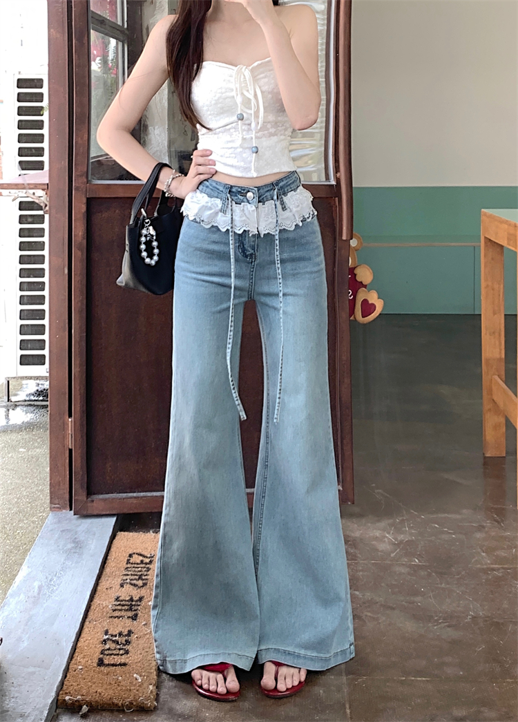 실제 사진과 실제 가격 ~ 허리 슬림 한 여성을위한 새로운 레이스 스 플라이 싱 직선 플레어 청바지 A- 라인 플레어 바지