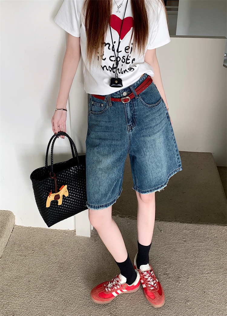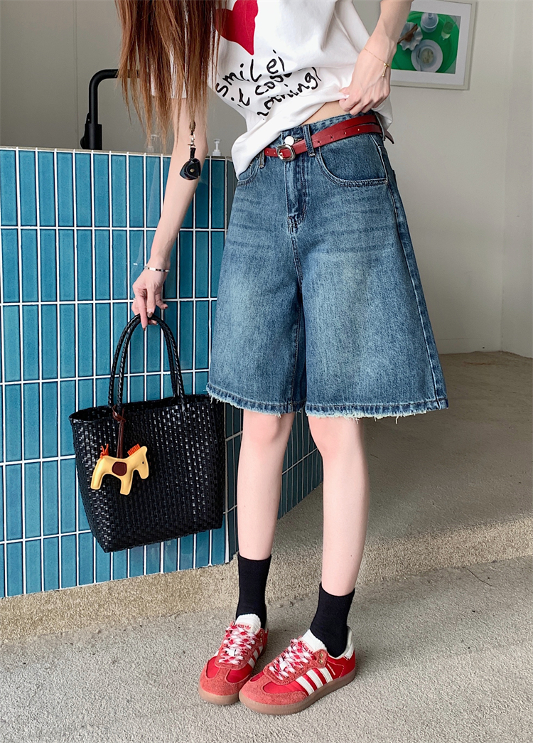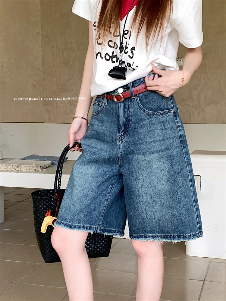 Real Shot Real Price ~ 여성의 새로운 하이 웨이스트 슬리밍 스트레이트 5 포인트 바지 중간 바지를위한 레트로 워시 와이드 레그 데님 반바지