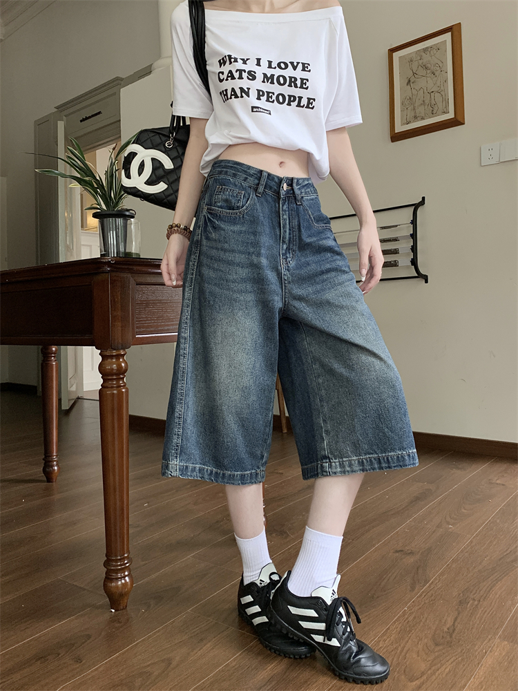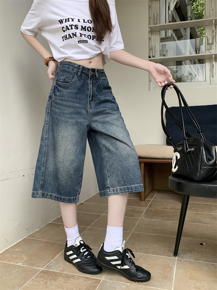 여성의 새로운 하이 웨이스트 슬림하고 느슨한 다목적 직선형 미드 팬츠를위한 실제 가격이 책정 된 미국 레트로 와이드 레그 7 크롭 피드 청바지