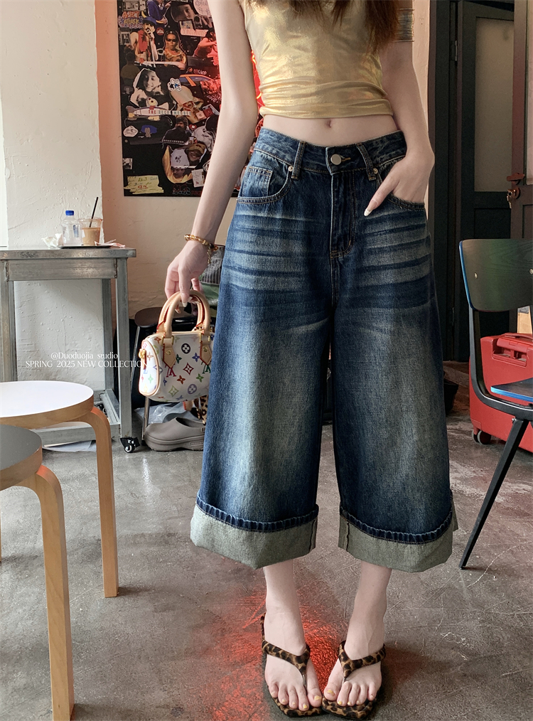 여성의 새로운 하이 웨이스트 느슨한 넓은 다리 연삭 흰색 세척 데님 중간 바지를위한 실제 가격이 책정 된 미국 스타일의 뒤집기 청바지