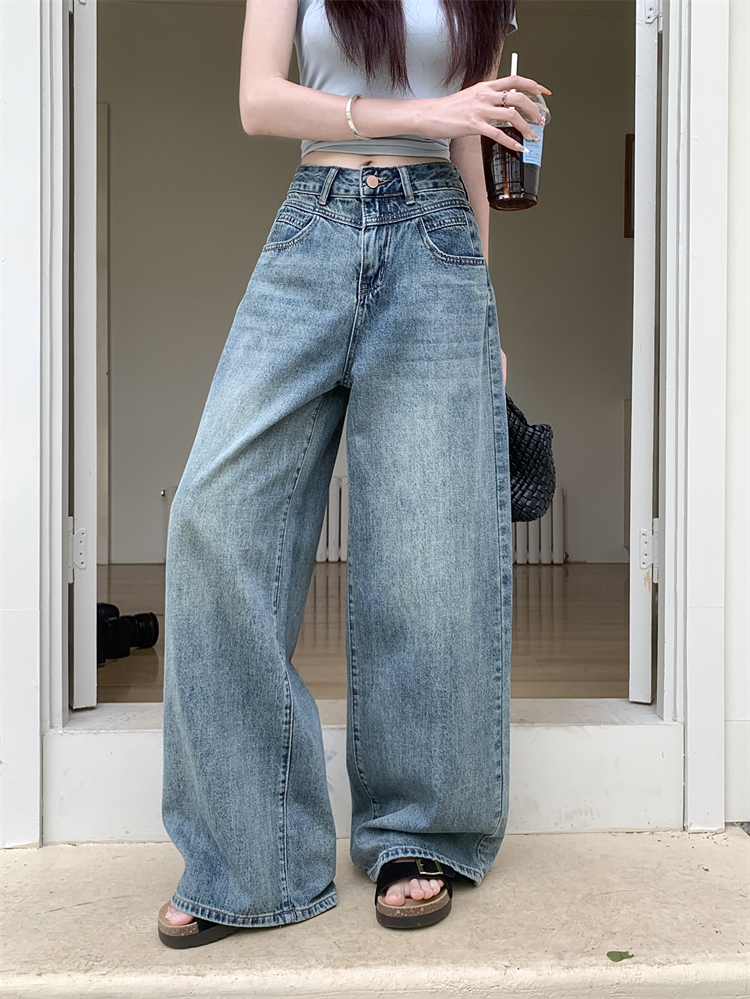 진짜 샷, 실제 가격 ~ 여성의 새로운 고갈이 느슨한 슬리밍 넓은 다리 바닥 바지를위한 미국 레트로 스트레이트 청바지