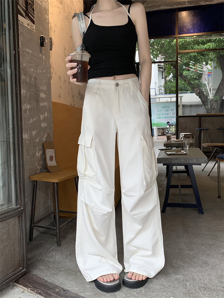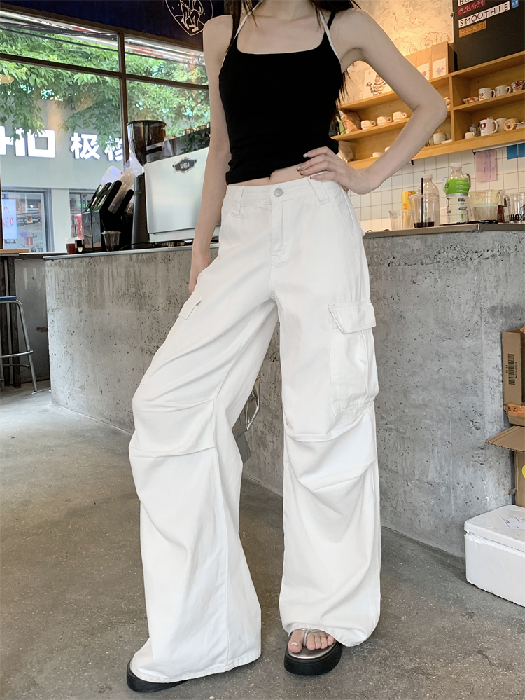 여성을위한 실제 가격이 책정 된 미국 화이트 작업복 포켓 청바지 새로운 하이 허리 슬리밍 스트레이트 레그 바닥 바지