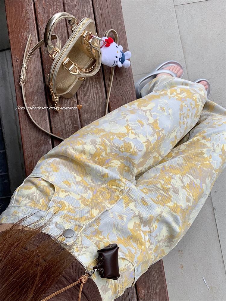 Real Shot, Real Price ~ tie-dye 인쇄 여성의 새로운 고갈 캐주얼 레트로 스트레이트 레그 바지를위한 넓은 고리 청바지