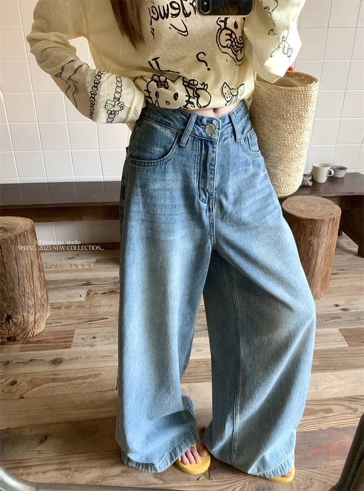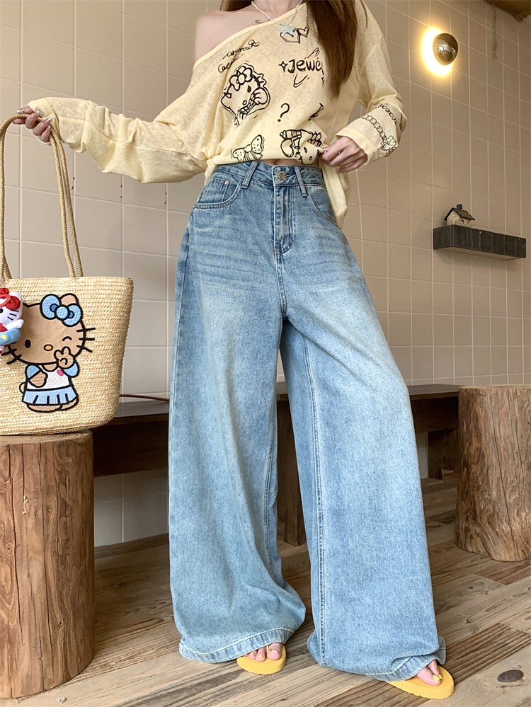 실제 샷 실제 가격 ~ 레트로 블루 와이드 레그 캐주얼 청바지를위한 하이 허리 슬리밍 직선 바닥 바지를 씻는 여성을위한 청바지