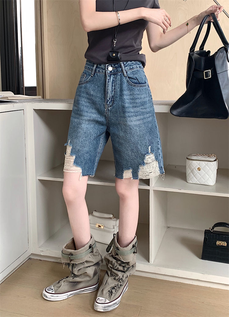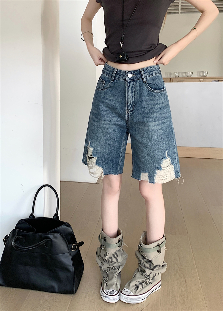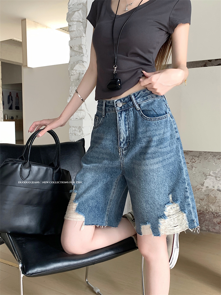 진짜 샷, 실제 가격 ~ 찢어진 넓은 다리 청바지, 여성의 새로운 고위 A- 라인 소형 직선형 중간 바지를위한 5 점 바지