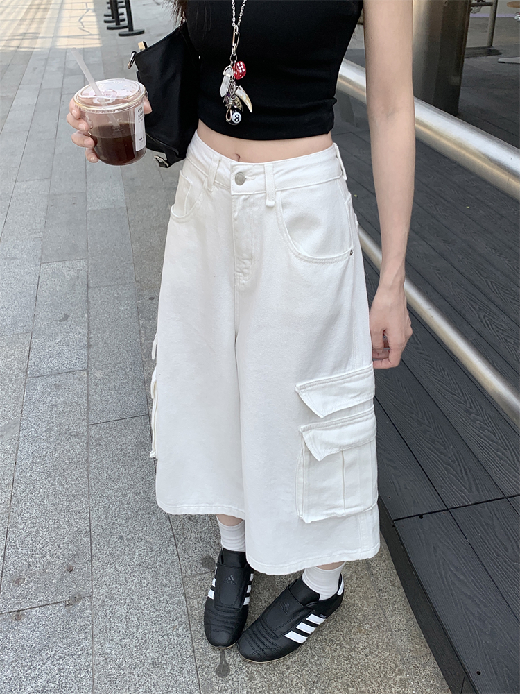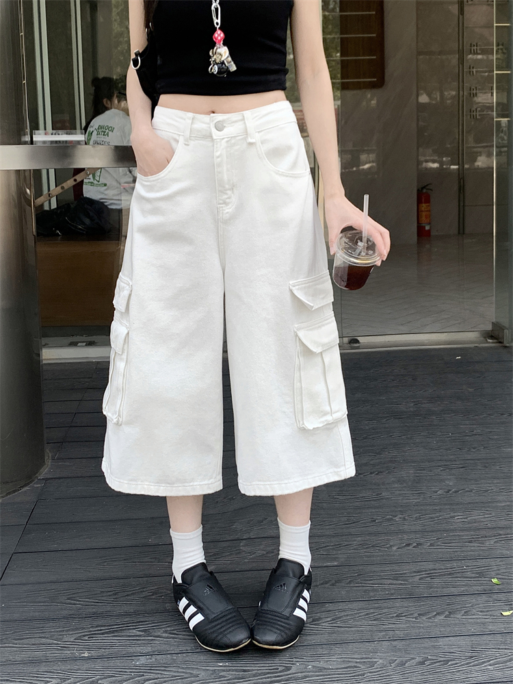 허리 느슨한 슬림 한 똑바로 미드 레그 바지를 입은 여성을위한 Real-Riced American High Street Work Pocket 8 포인트 와이드 레그 청바지