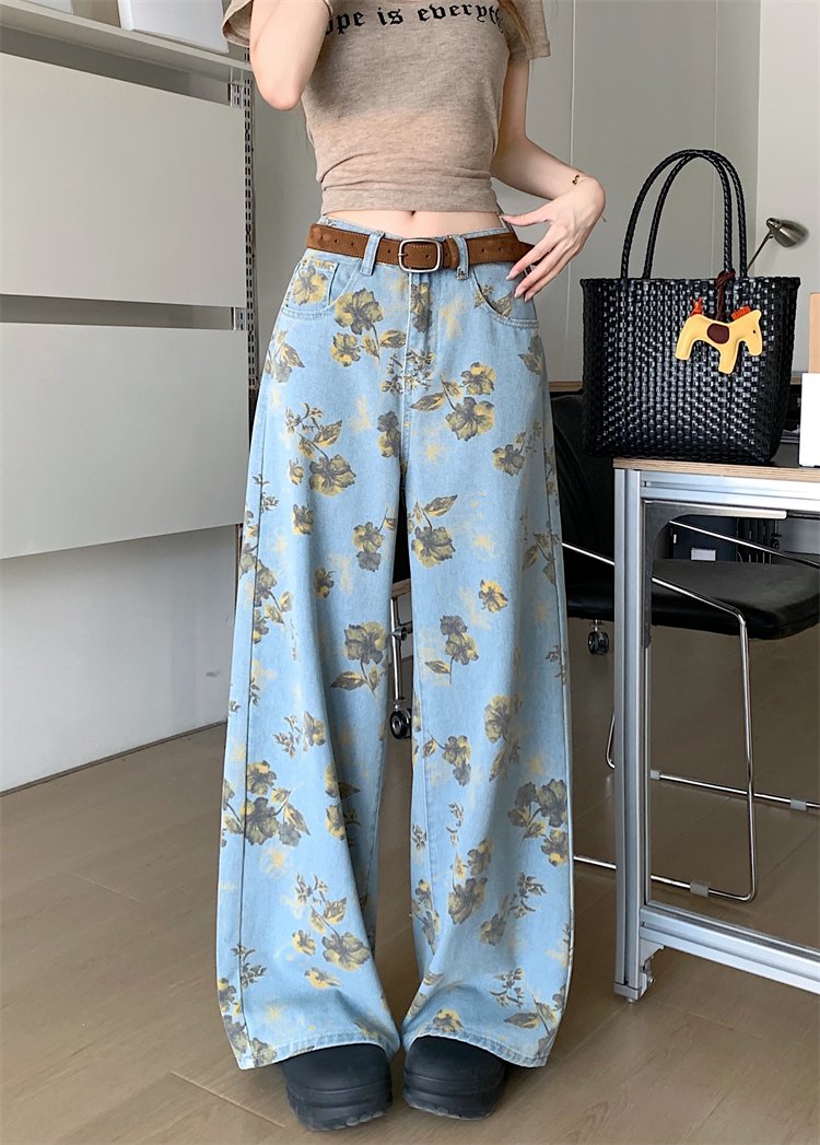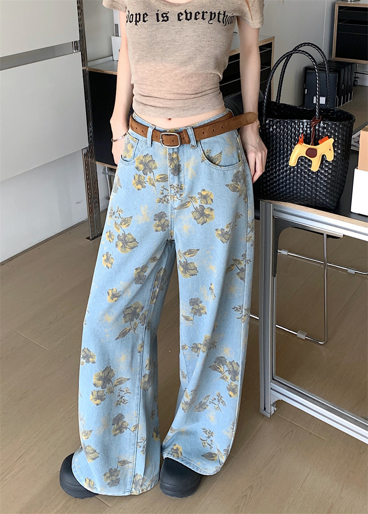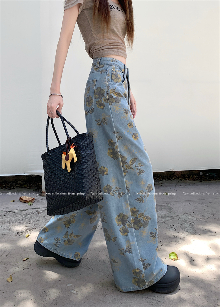 Real Shot, Real Price ~ American Retro 인쇄 틈새 디자인 높은 허리 직선 바닥 바지를 가진 여성을위한 넓은 고리 청바지