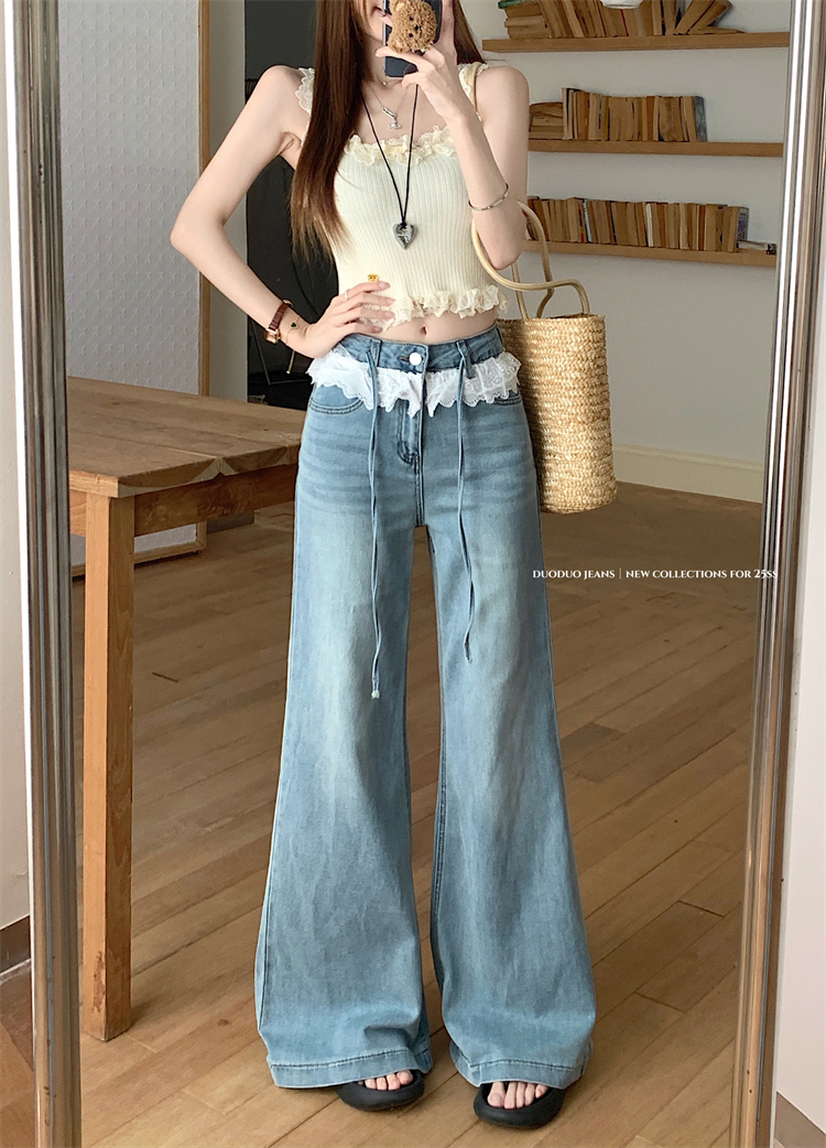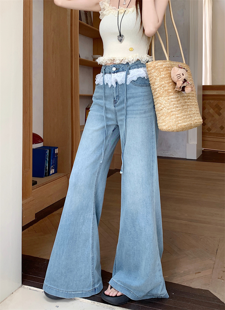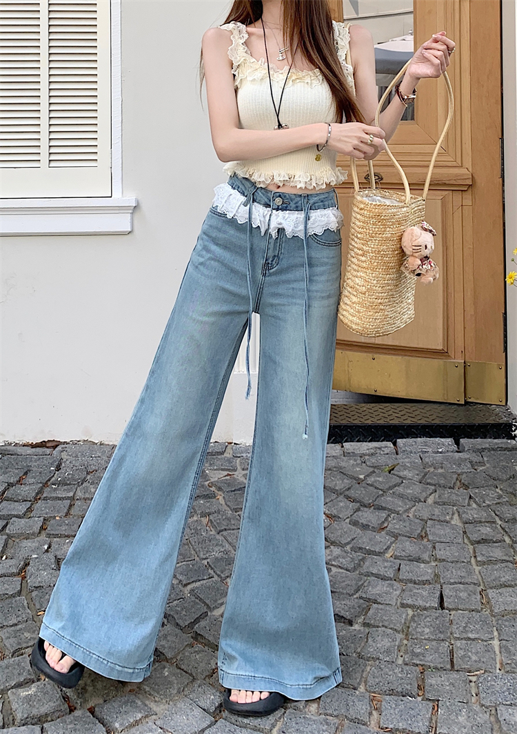 실제 사진 실제 가격 레이스 디자인과 여성의 새로운 고위, 느슨한 넓은 레그 바지를위한 약간 플레어 청바지
