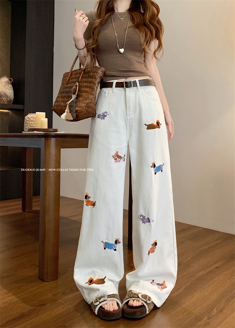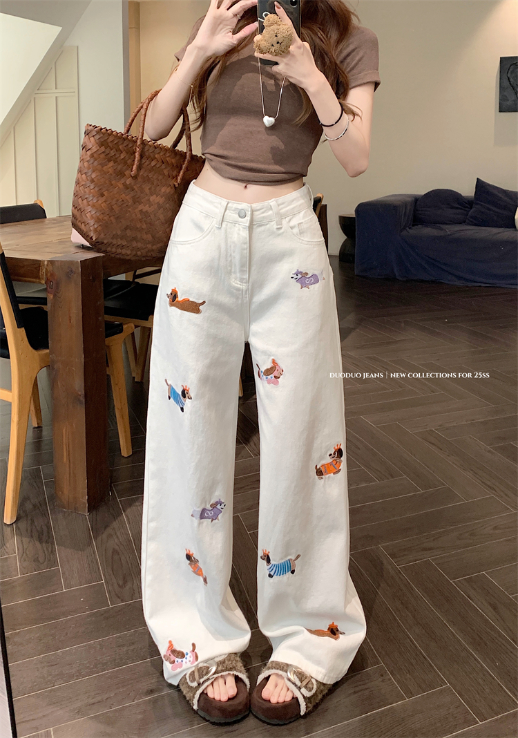 진짜 샷, 실제 가격 ~ 만화 닥스 훈트 개 3 차원 자수 넓은 넓은 레그 청바지를위한 새로운 하이 웨이스트 슬림 한 직선 바지