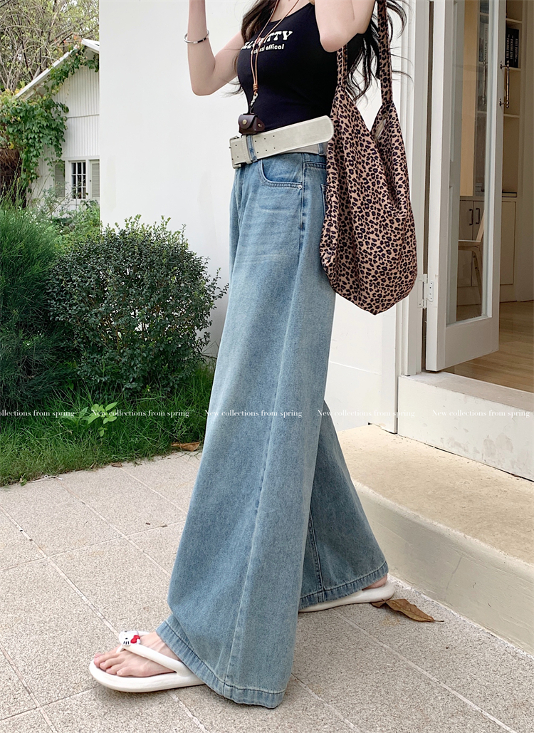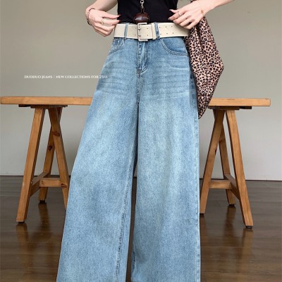 여성의 새로운 스타일 느슨하고 날씬하고 게으른 드레이프 스트레이트 레그 바닥 바지를위한 실제 레트로 하이 웨이스트 와이드 레그 청바지