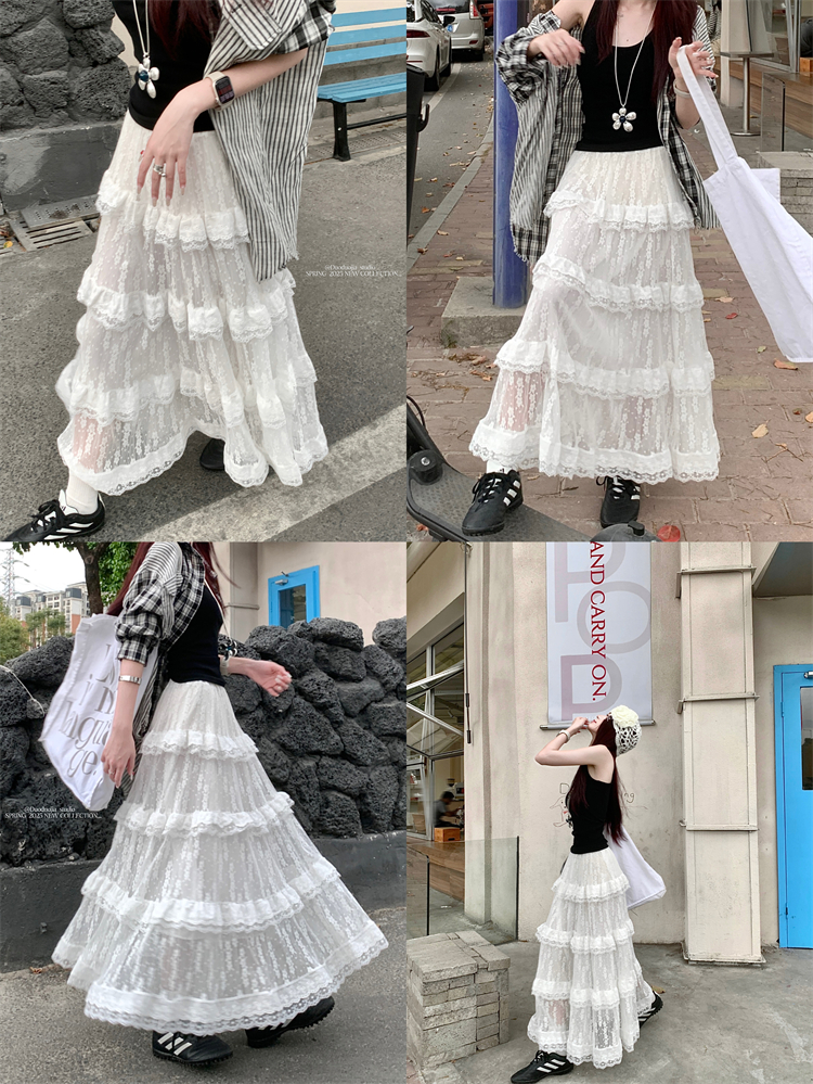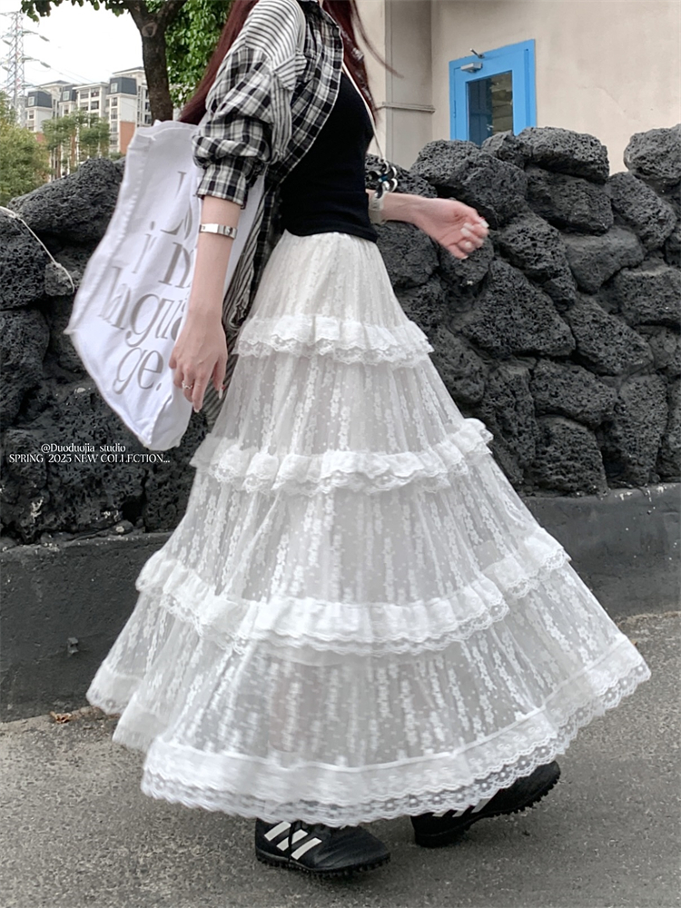 실제 발레 스타일 디자인 레이스 레이스 케이크 스커트 여성을위한 새로운 달콤하고 푹신한 다목적 긴 치마
