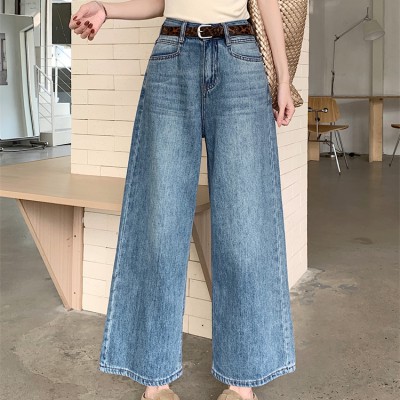 허리가 똑바로 슬리밍되고 다재다능한 9 점 바지를 가진 여성을위한 미국 레트로 와이드 레그 청바지