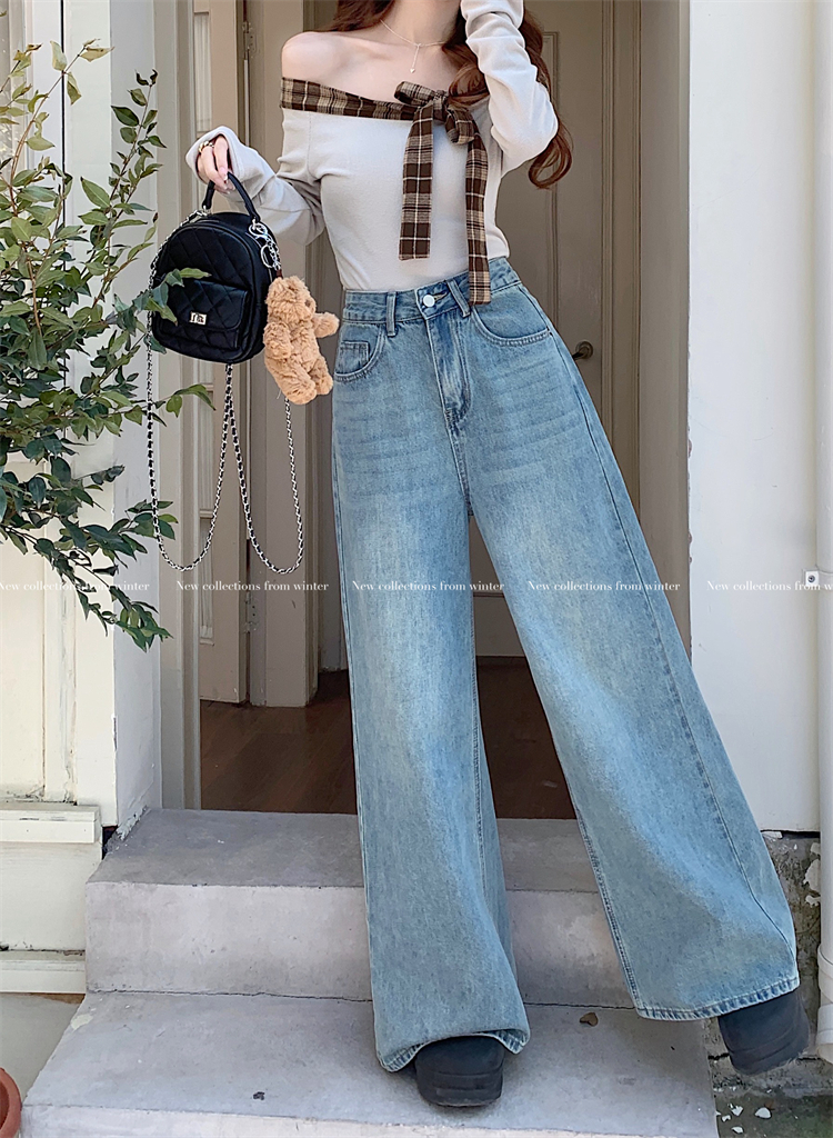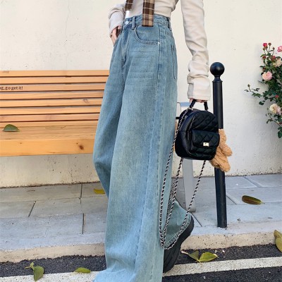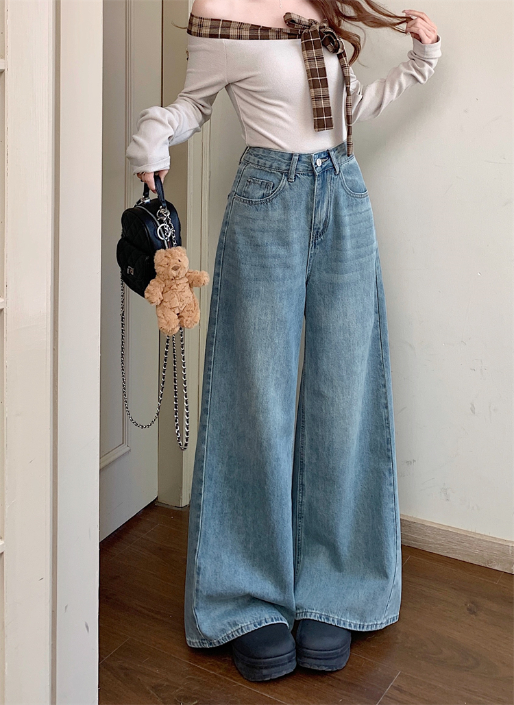 미국 레트로 디자인 허리를 슬리밍하는 스트레이트 다운 드레이프 바닥 바지를 가진 여성을위한 넓은 레그 청바지