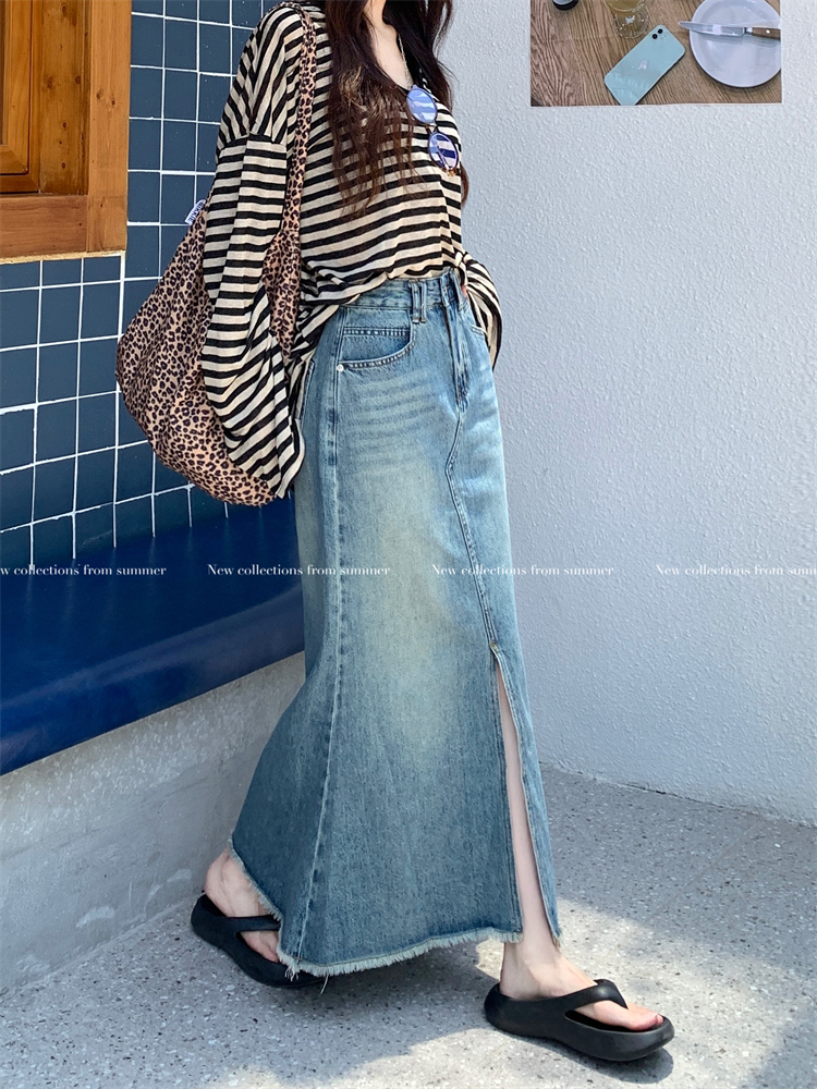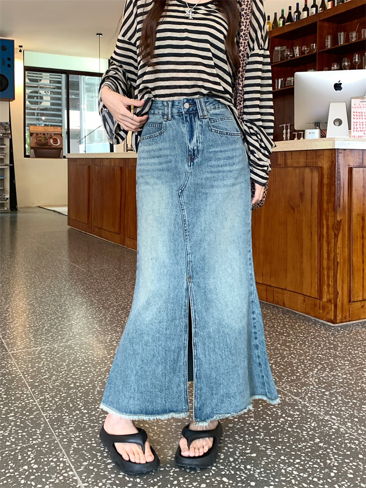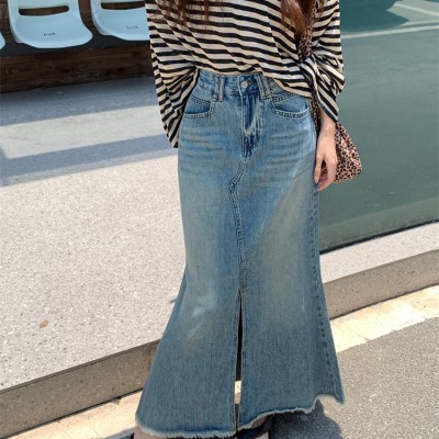 여성의 새로운 고도의 슬림 한 A- 라인 낚시 힙합 긴 스커트를위한 미국 레트로 모피 데님 스커트