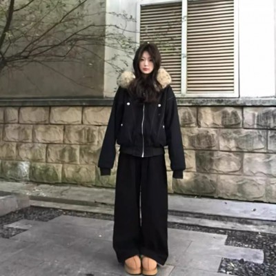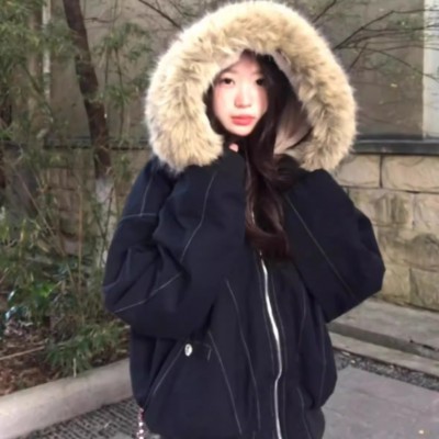 아메리칸 레트로 검정색 좌 산 조각 재킷 여자 가을 겨울 Parker 서비스 털이 있고 두꺼운 국가 트렌디 쇼트 스타일 재킷 면 의류
