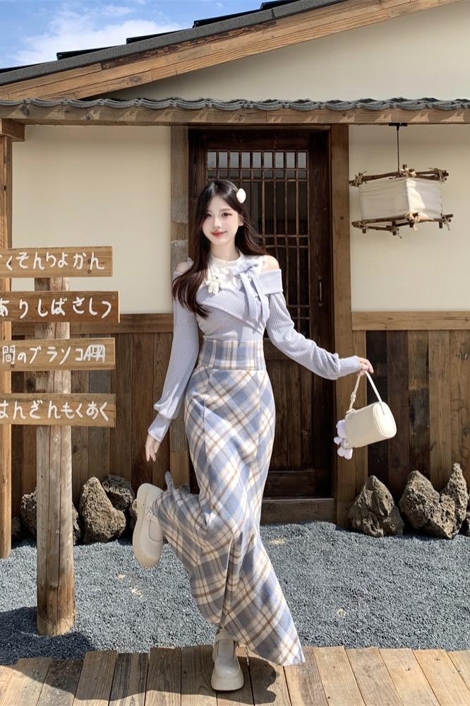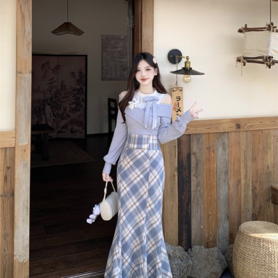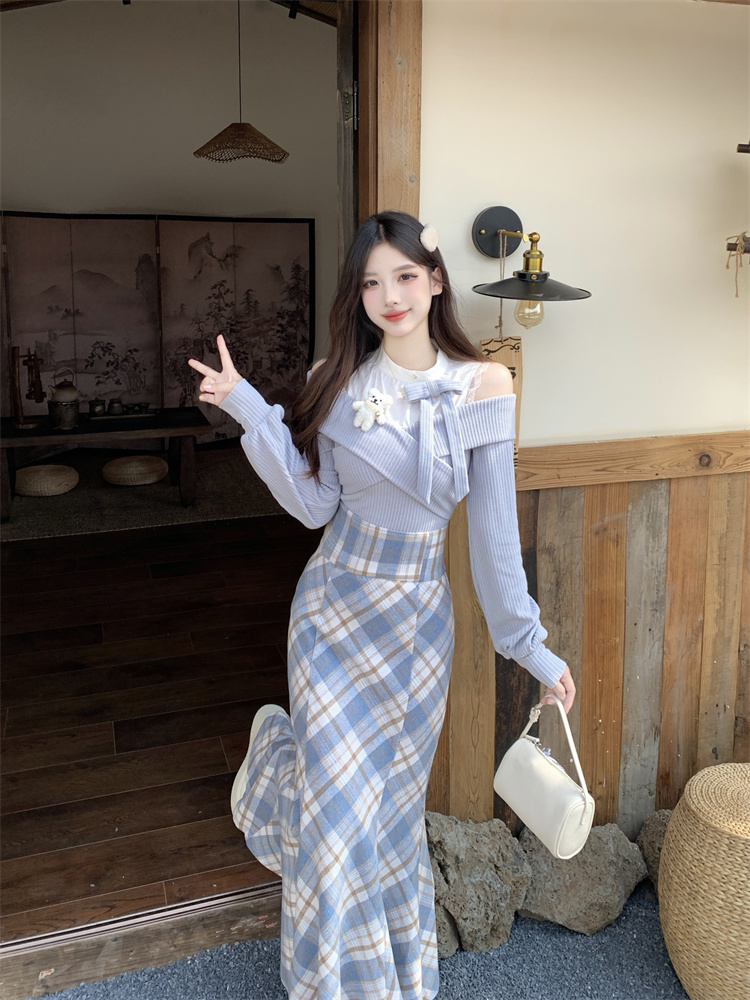 안개 블루 작은 곰 천 골드 센스 체크무늬 타이트 스커트 반신 인어 꼬리 스커트 여성 가을 페이크 레이어드 블루 맨위