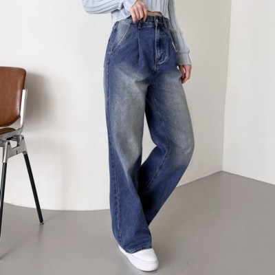 핀턱 여성 와이드 청바지 데일리 워싱 데님 팬츠 진청