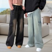 머드워싱 밴딩 카고 와이드 데님 팬츠