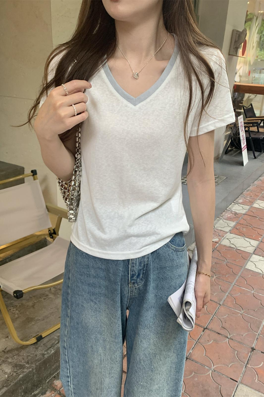 실제 사진 여름 슬림 v- 넥 단순하고 다재다능한 주름이있는 디자인 순수면 단락 티셔츠 여성