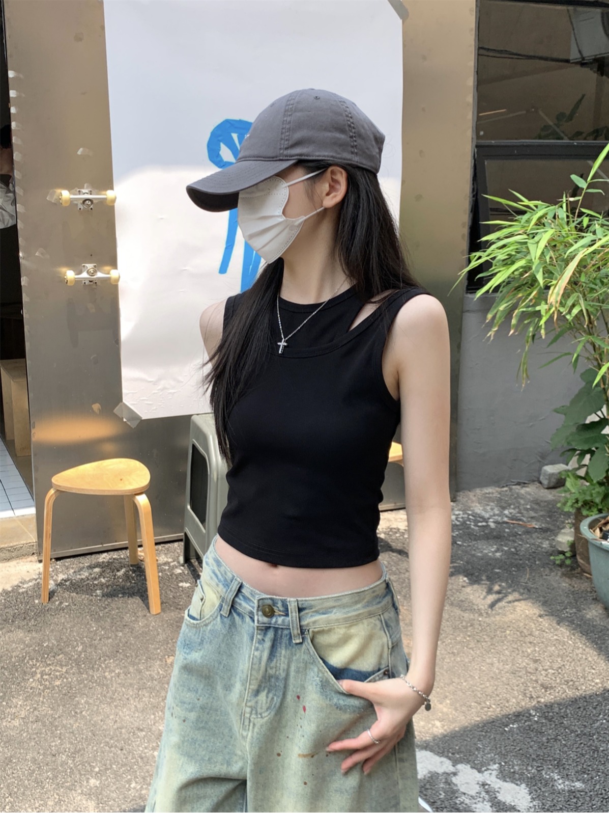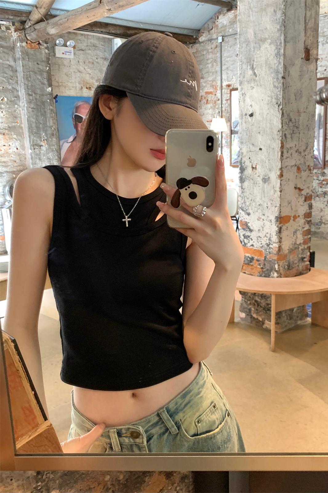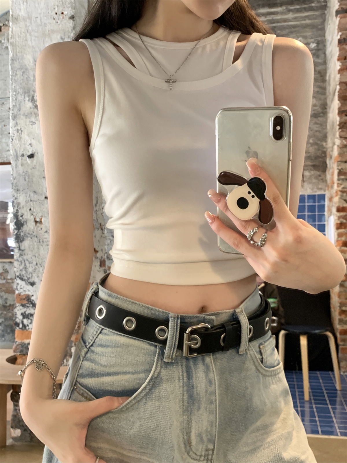 실제 사진 여름 한국 스타일 프랑스 순수한 섹시한 대조적 인 대비 탄성 슬림 기본 서스펜더 조끼 여성을위한 탑
