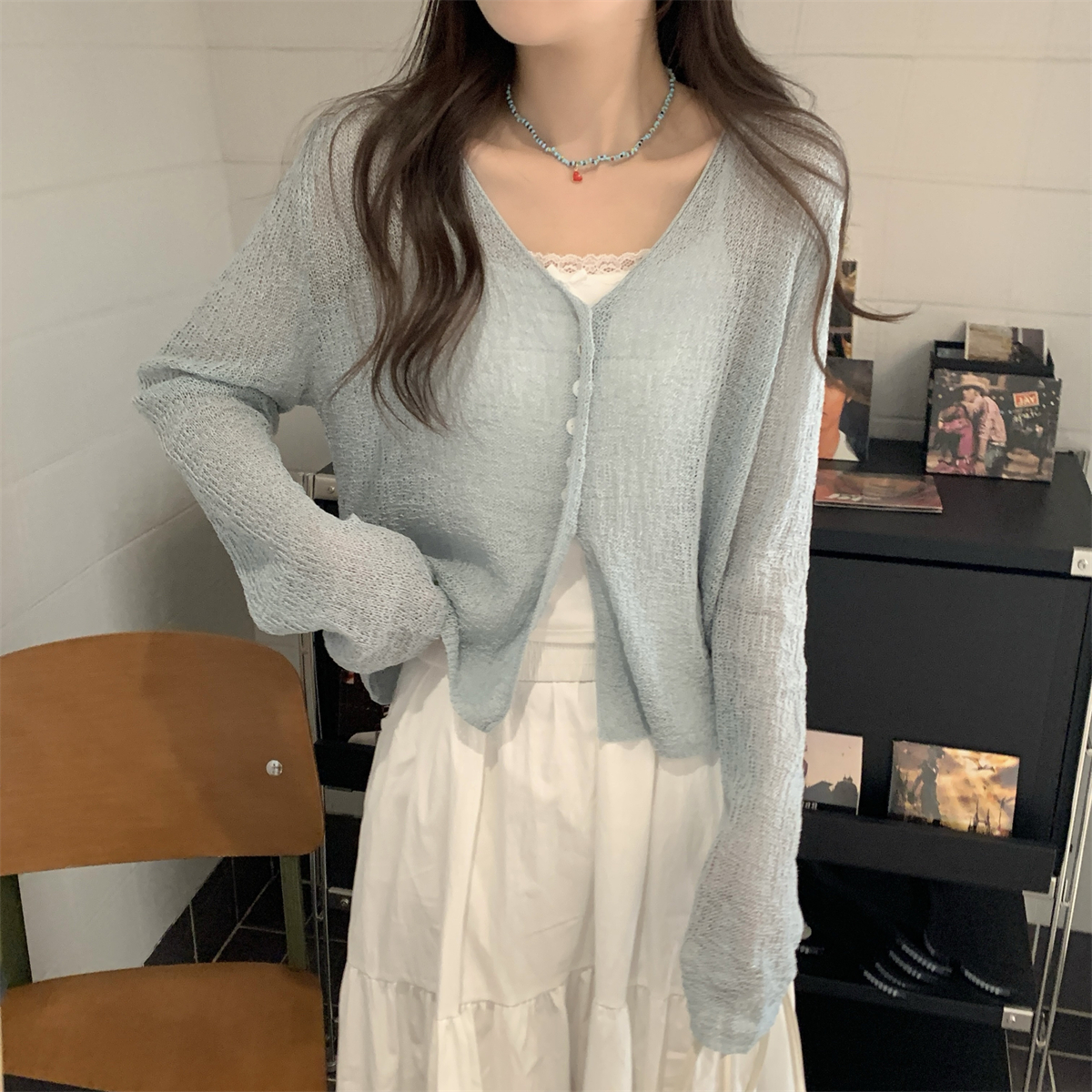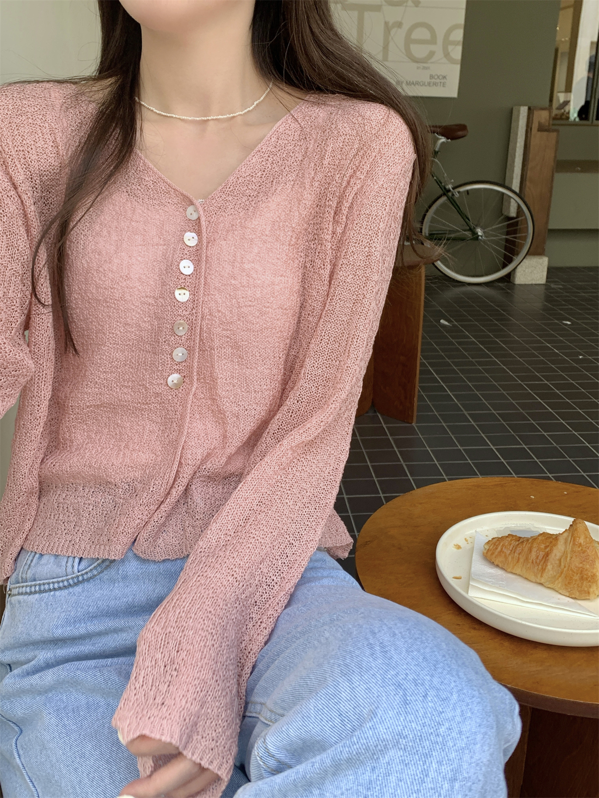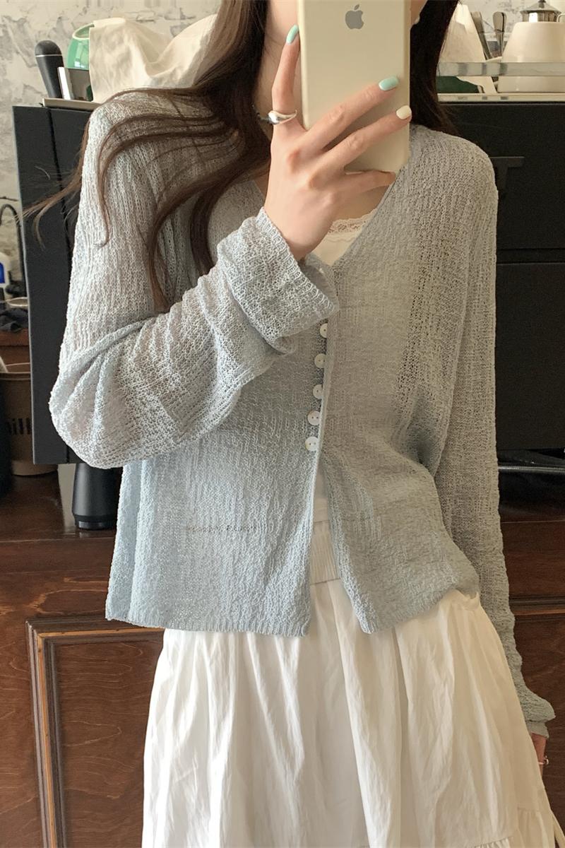 실제 주사 및 여름 한국어 버전 V- 넥 스위트 3 차원 꽃 싱글 브레스트 태양 보호 긴 슬레이브 니트 카디건 탑