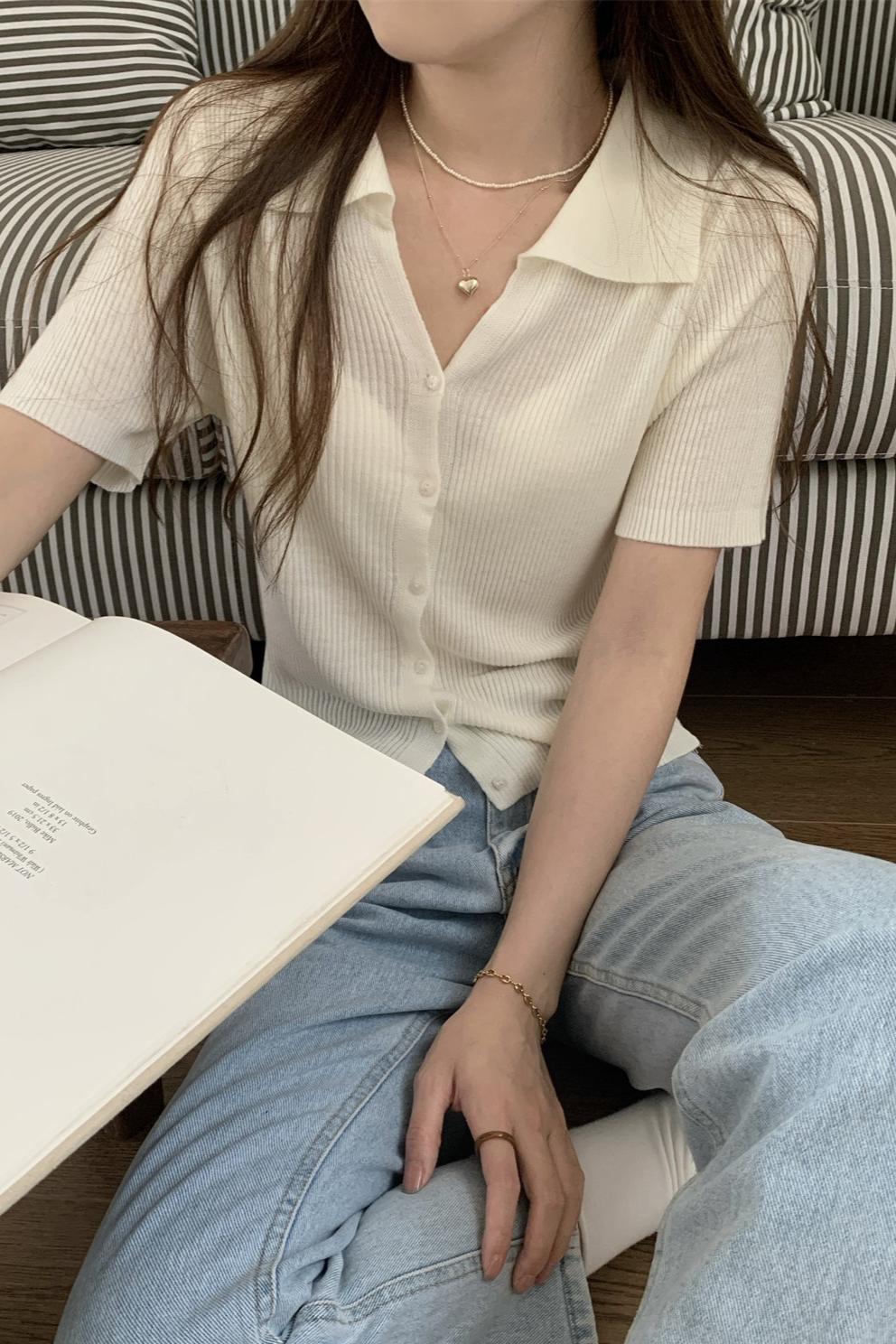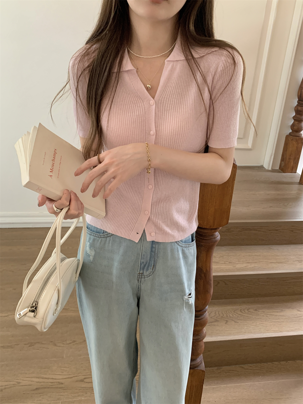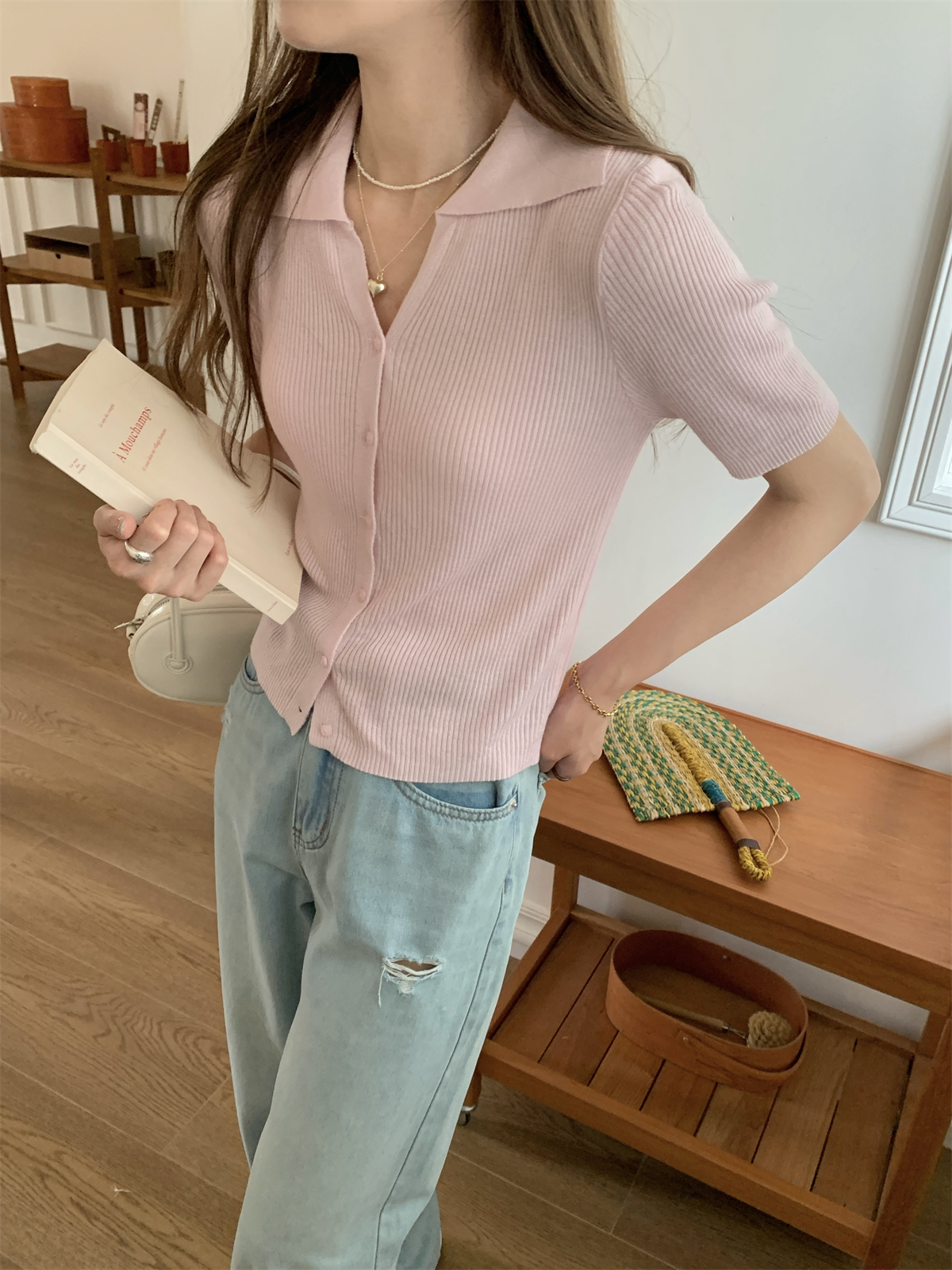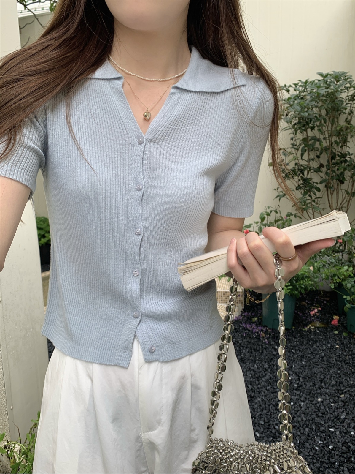 실제 여름 여름 한국어 버전의 슬림 걸림 사각형 칼라 단색 대해 순수면 단락 테 셔츠 여성을위한