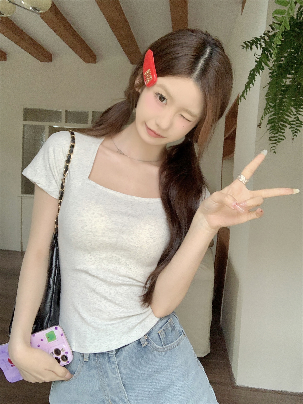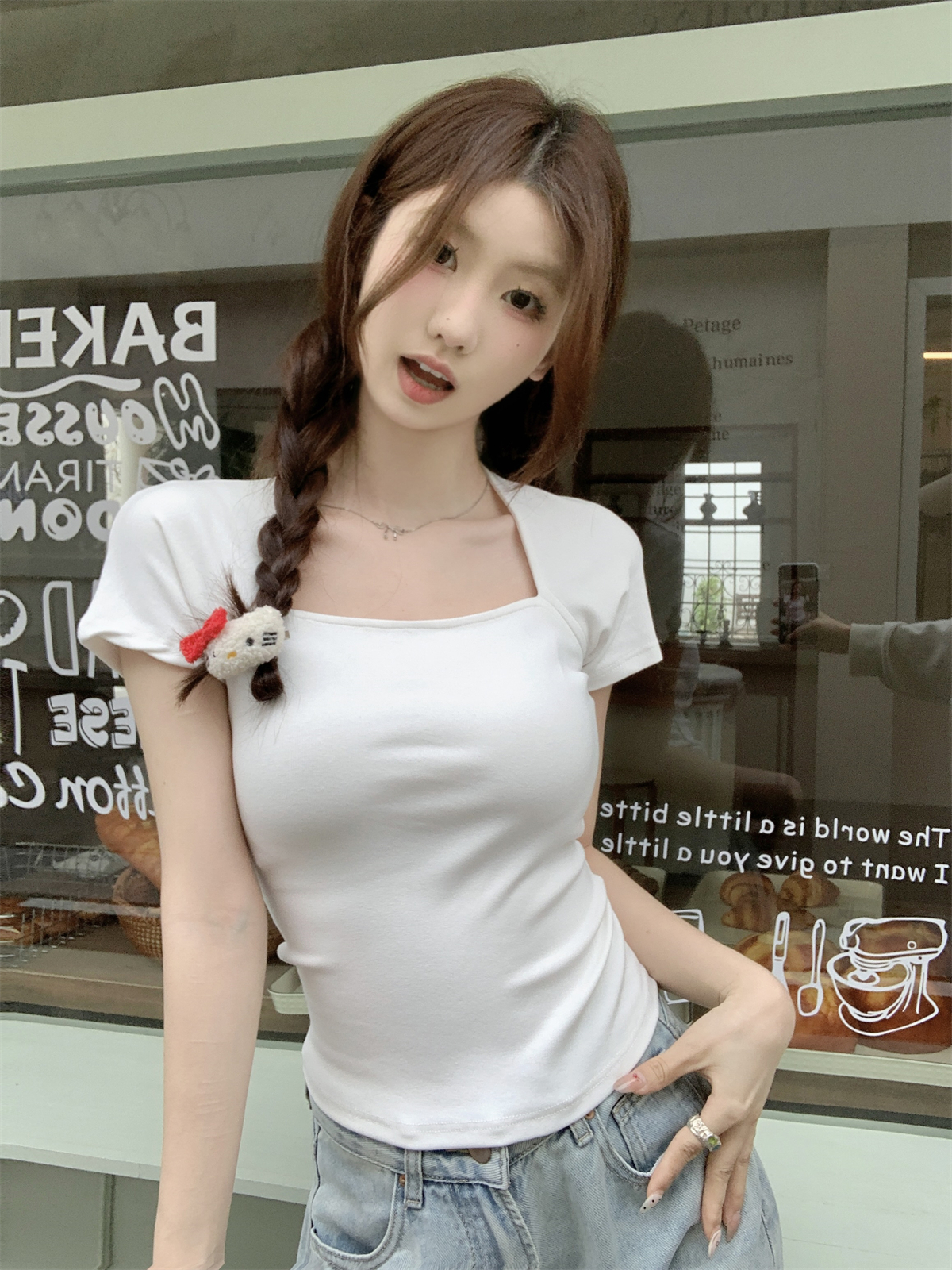 실제 여름 여름 한국어 버전의 슬림 한 쇄골 순수한 레이스 업 슬림 디자인 순수면 단락 티셔츠 탑