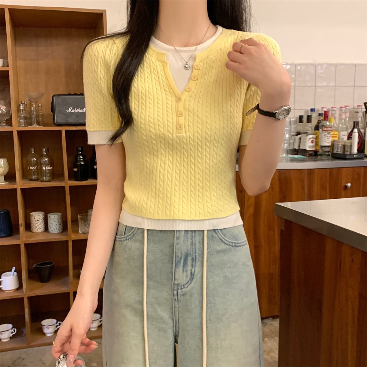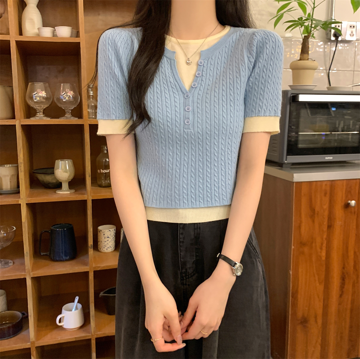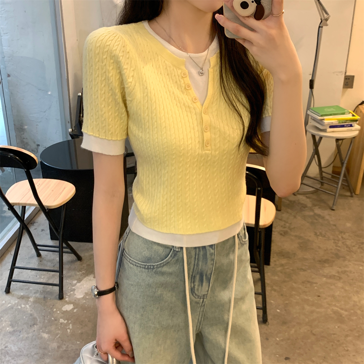 실제 사진 봄 여름 슬림하고 순수한 색상 대비 버튼 작은 짧은 면화 짧은 슬리브 티셔츠 여성을위한 탑