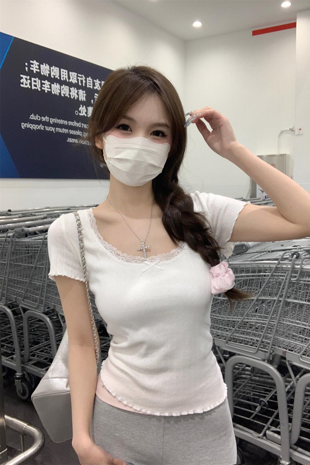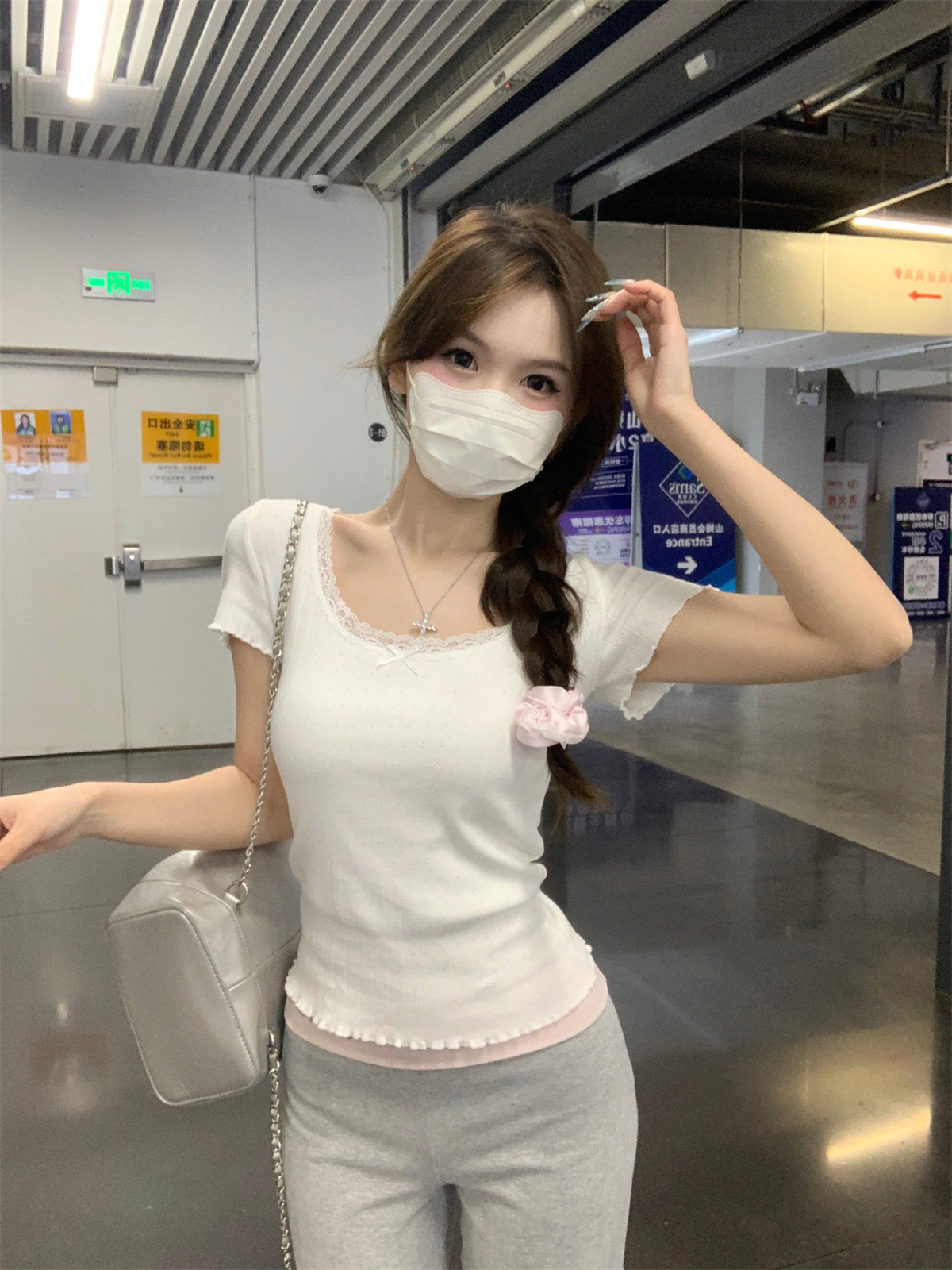 실제 주사와 여름 의 빅 둥근 목 기질 주름이 주름 단순 슬림면 단락 탑 티셔츠