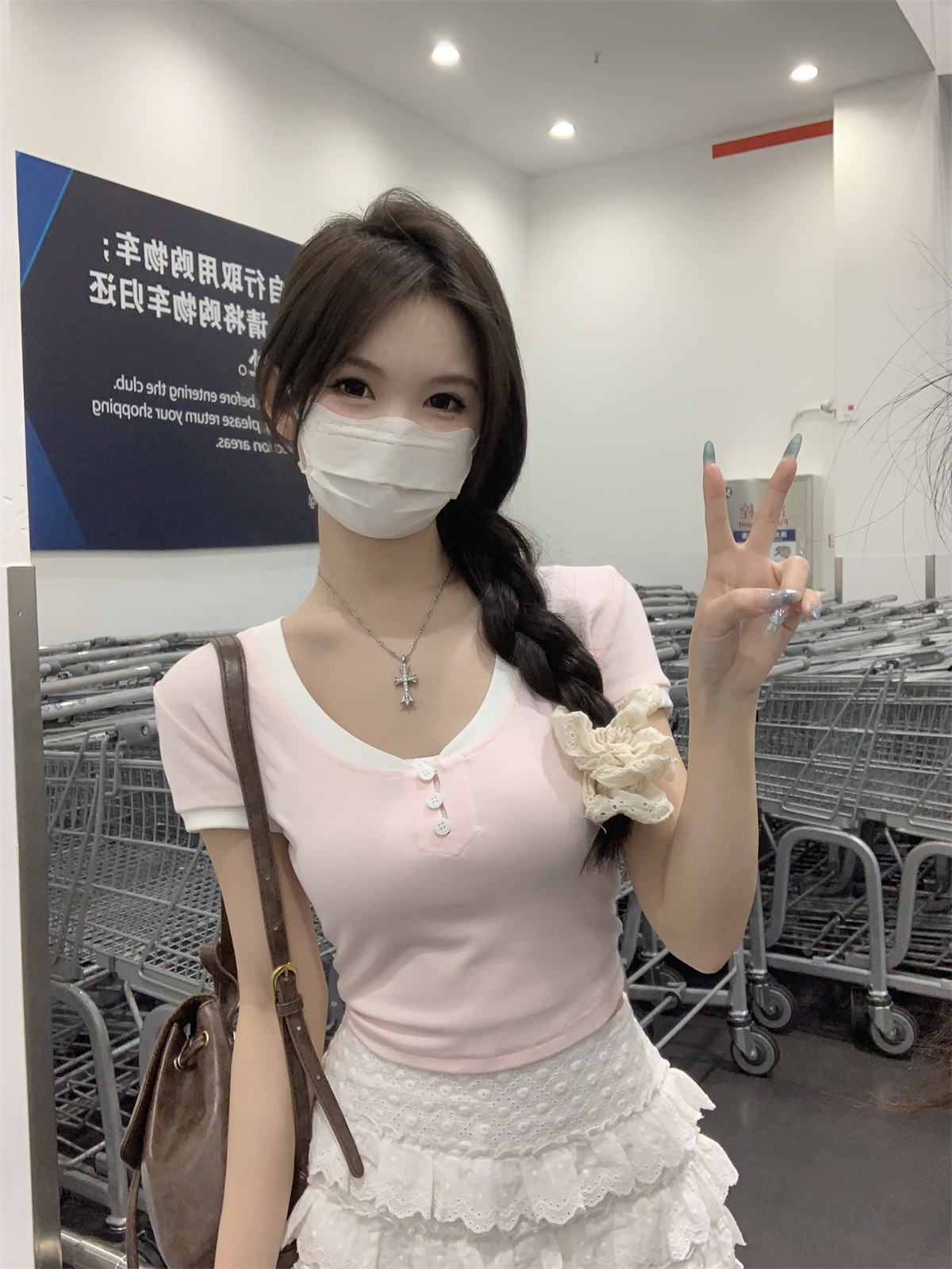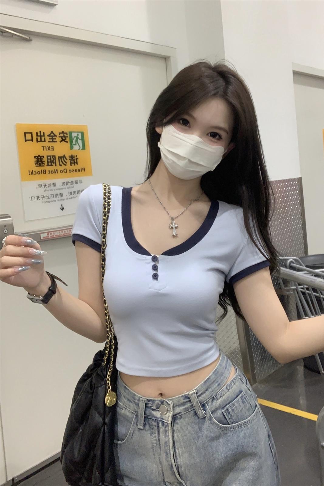 실제 사진 여름 한국 스타일 폴로 칼라 램핑 어깨 대비 컬러 슬리밍 디자인 순수면 단락 상단 티셔츠