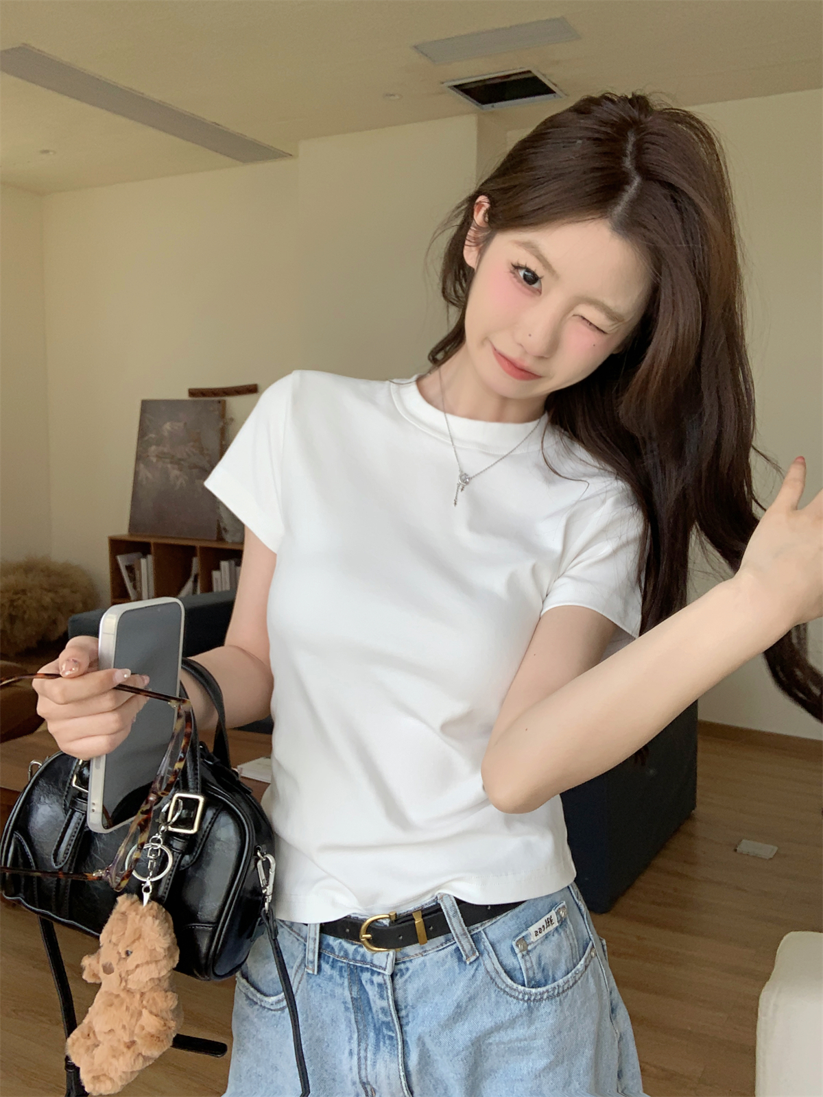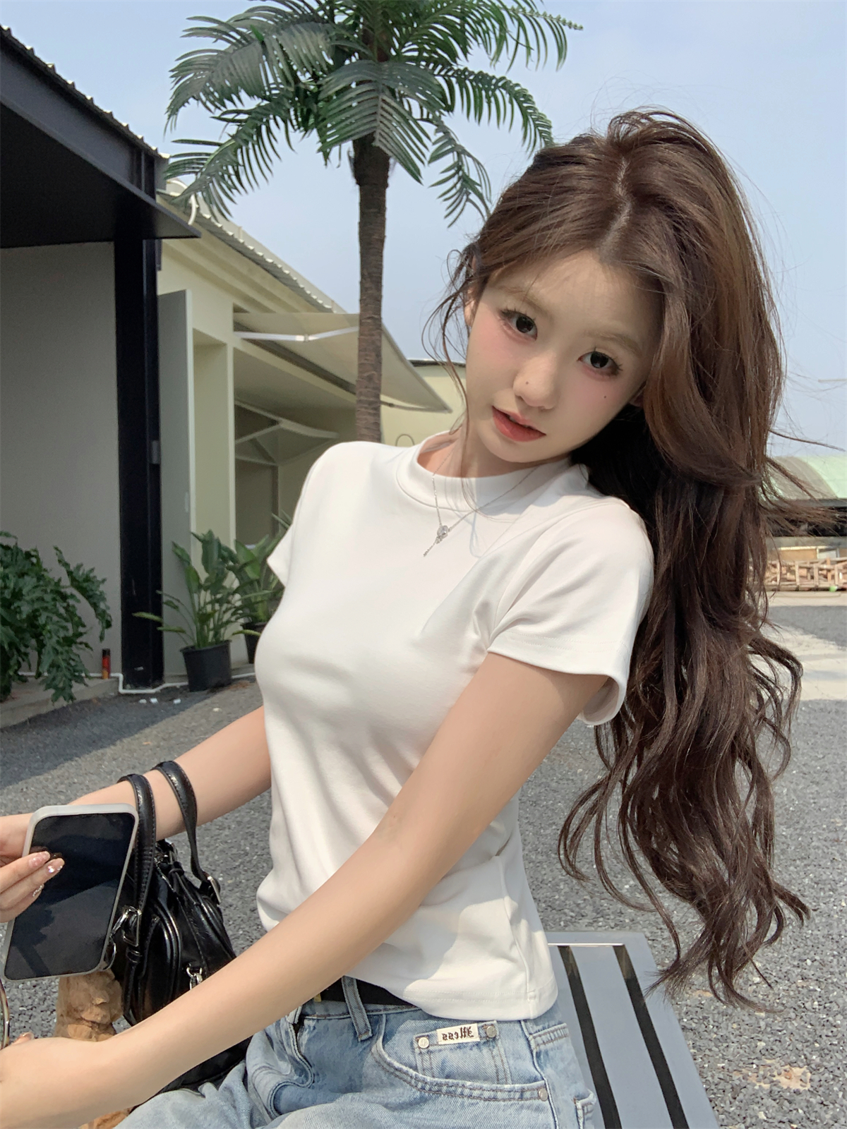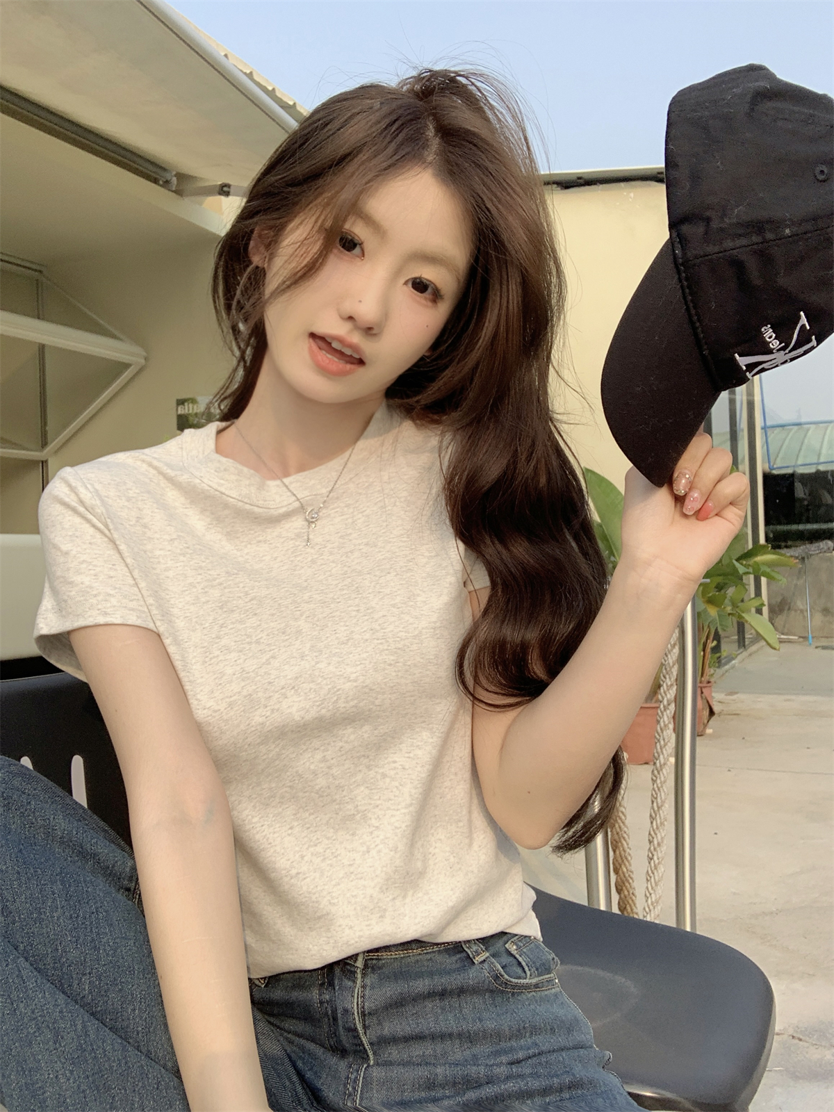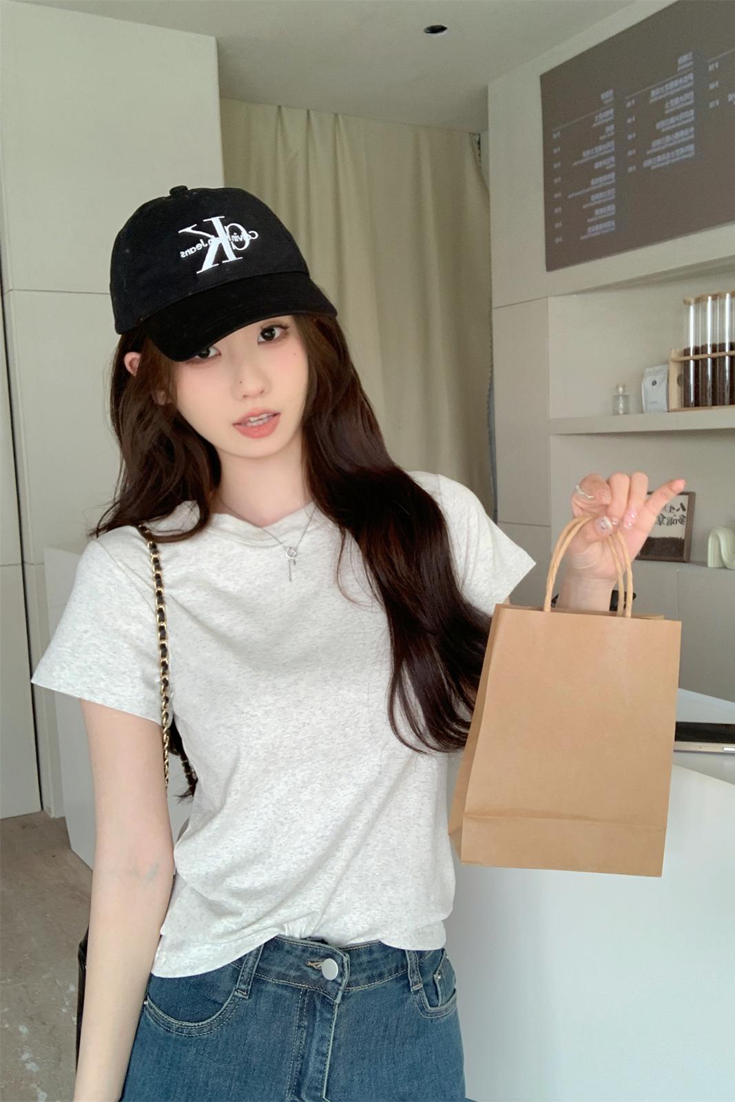 여름 한국어 버전 V- 넥 대비 컬러 슬림 문자 인쇄 바 스트립 디자인 순수면 단락 티셔츠 탑